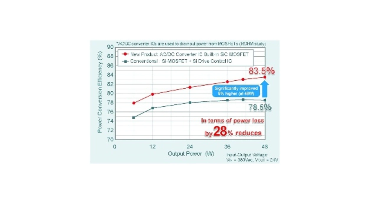 Bild 3 vergleicht die Wirkungsgrade des Wandlers mit dem BM2SCQ123T (rote Kurve) und einer diskreten Implementierung mit zwei in Serie geschalteten Silizium-MOSFETs (blaue Kurve). Der hervorgehobene Wirkungsgrad für den BM2SCQ123T liegt im angestrebten 48-W-Leistungsbereich um 5 Prozent höher und die Verlustleistung um 28 Prozentniedriger als bei einem Wandler mit Silizium-MOSFET. Ein Kühlkörper ist nicht erforderlich. Der Grund dafür ist, dass der Einschaltwiderstand RDS(on) des SiC-MOSFETs viel kleiner ist als der der Silizium-MOSFETs.