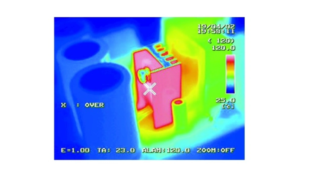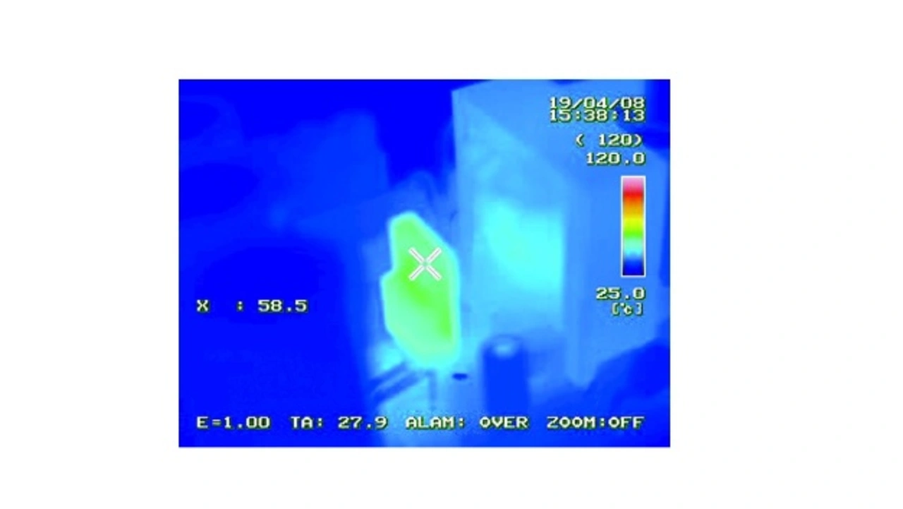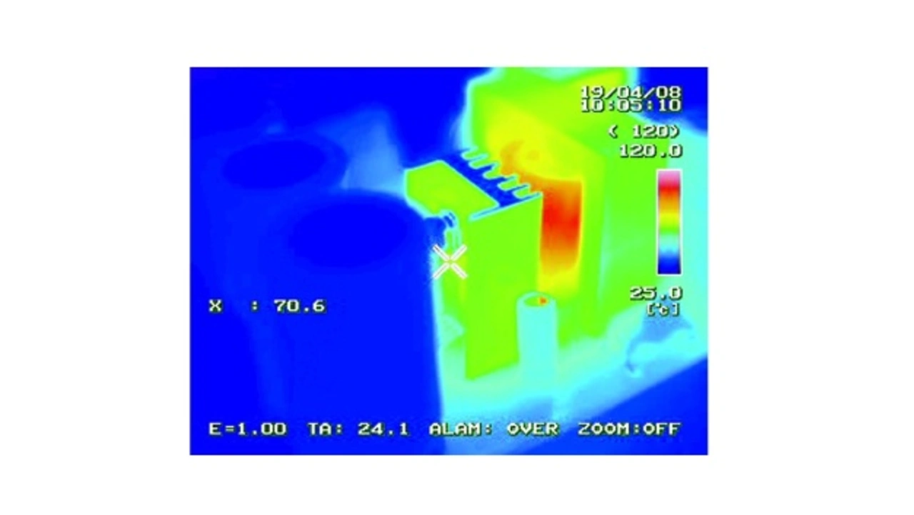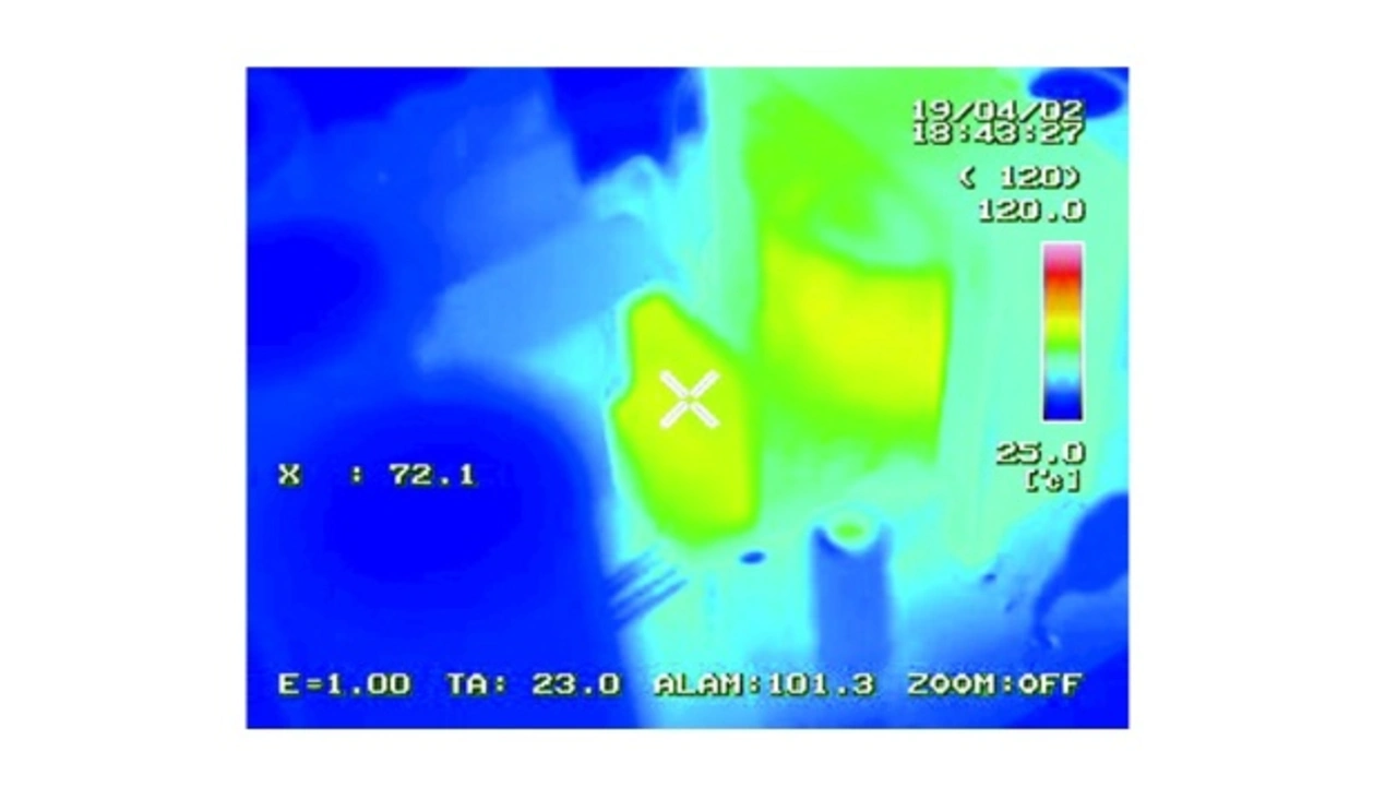 Eine Thermografie dokumentiert die unterschiedlichen Verluste. Im gleichen Leistungsbereich von 48 W steigen die Temperaturen bei der diskreten Implementierung mit Silizium-MOSFETs trotz Kühlkörper auf über +120 °C (Bild 4). Im Gegensatz dazu beträgt die Temperatur auf dem BM2SCQ123T-EVK-001 nur +72 °C – und zwar ohne Kühlkörper (Bild 5).
