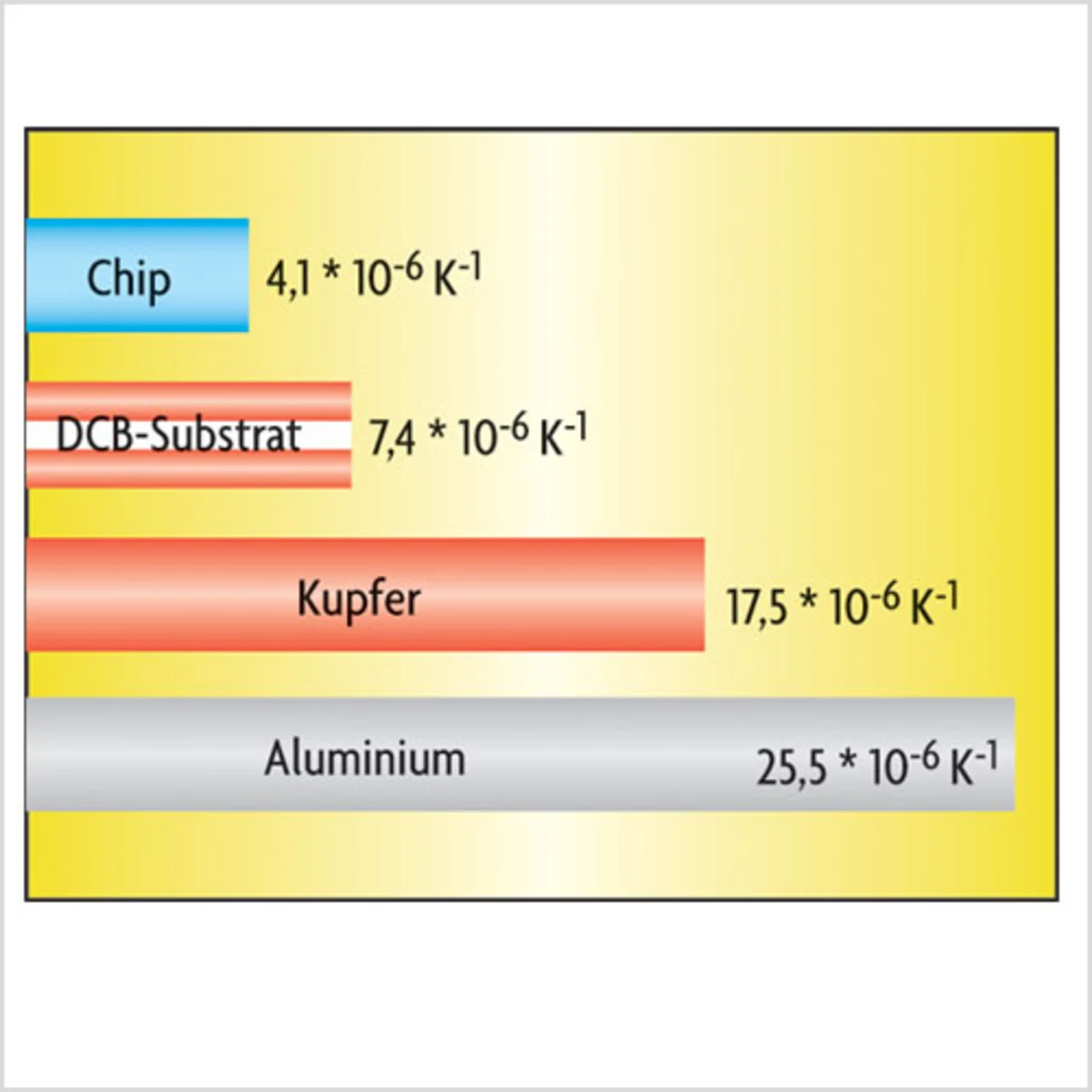 Ein spezifisches Merkmal von Leistungshalbleitermodulen ist, dass Strom und Wärme auf getrennten Wegen geleitet werden. Verschiedene Materialien wie Isolatoren, Leiterbahnen und natürlich Halbleiter müssen miteinander verschaltet werden. Wegen der unterschiedlichen thermischen Ausdehnungskoeffizienten (Coefficient of Thermal expansion, CTE) entstehen an den Verbindungspunkten der einzelnen Materialien während der Temperaturund Lastwechsel mechanische Spannungen. Diese Spannungen verhalten sich proportional zu den CTE-Differenzen der Materialien, der Länge der feststehenden Verbindungen und dem Temperaturhub ΔT. Deshalb muss die Auslegung der Module an die thermischen Anforderungen der jeweiligen Applikation angepasst werden [2]. Um die CTE-Unterschiede zwischen DCB und Halbleitermaterial in den neuen Modulen auszugleichen, wurde ein neuartiges Lötzinn verwendet.