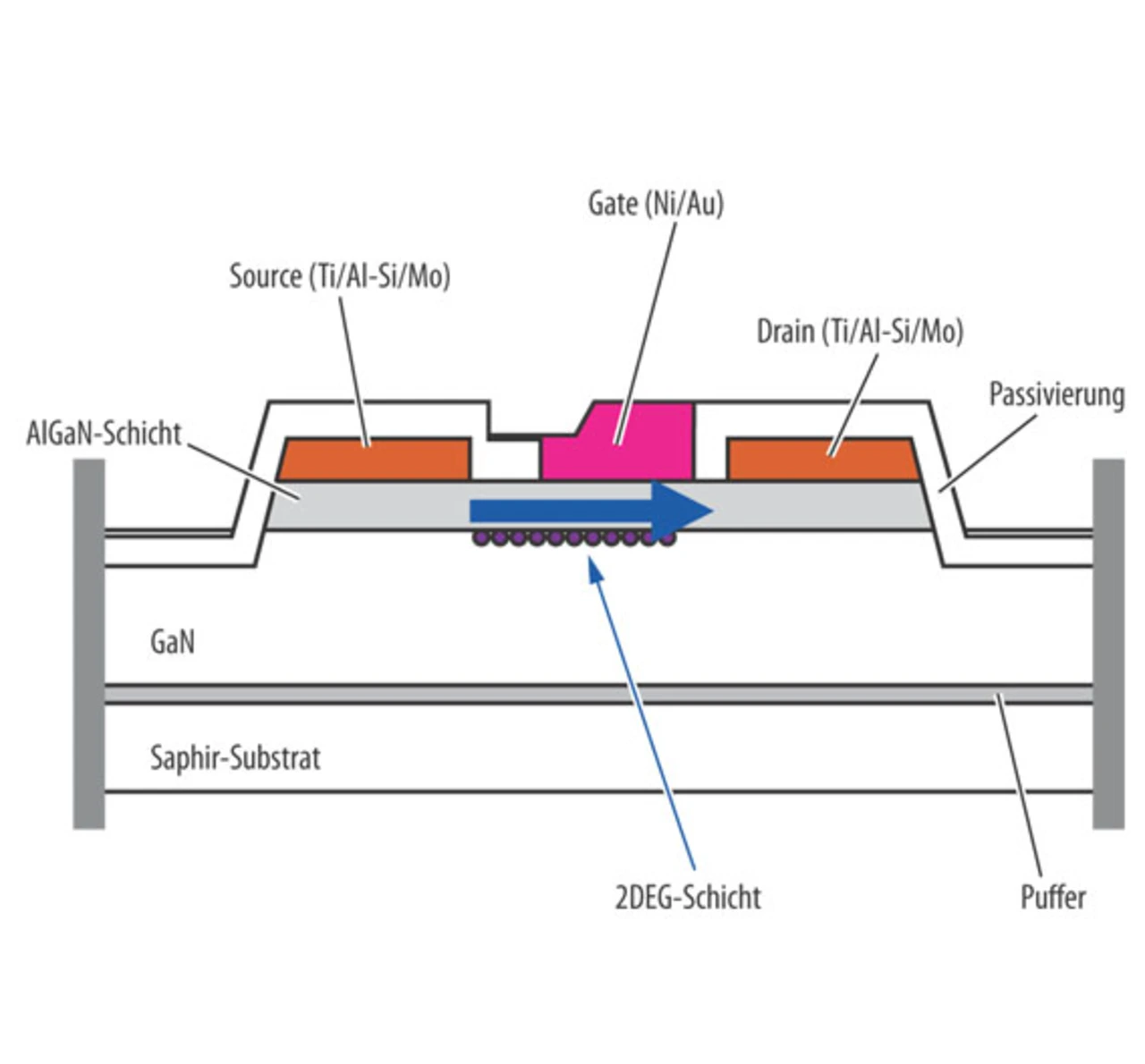 Durch eine geschickte Wahl der Schichtfolgen bildet sich ein zweidimensionales Elektronengas (2DEG) aus, dessen Beweglichkeit µ parallel zur Grenzschicht praktisch nicht eingeschränkt ist. Dadurch ist in diesem Bereich der spezifische Einschaltwiderstand im Vergleich zu SiC wesentlich niedriger. Allerdings können sich die Elektronen in dieser Halbleiterstruktur effektiv nur in zwei Dimensionen bewegen (Bild 2). Fast alle Ansätze bei GaN nutzen diesen 2DEG-Effekt, z.B. in Form der sogenannten High Electron Mobility Transistoren (HEMT).