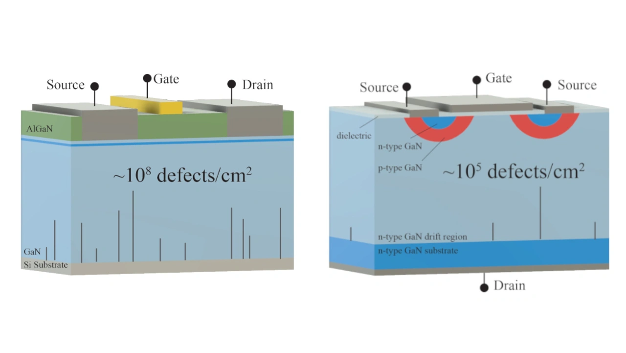 Horizontal leitende GaN-HEMTs (High Electron-Mobility Transistor), wie sie heute üblich sind, werden auf Silizium-Wafern gefertigt. Da der Strom durch Kontakte auf der Oberfläche fließt, ist die Wahl des Substrats nicht ausschlaggebend, da dieses nicht im Strompfad liegt. Dies ist insofern ein Vorteil, da Silizium ziemlich preiswert ist und Wafer mit großen Durchmessern verfügbar sind, um Skaleneffekte nutzen zu können.