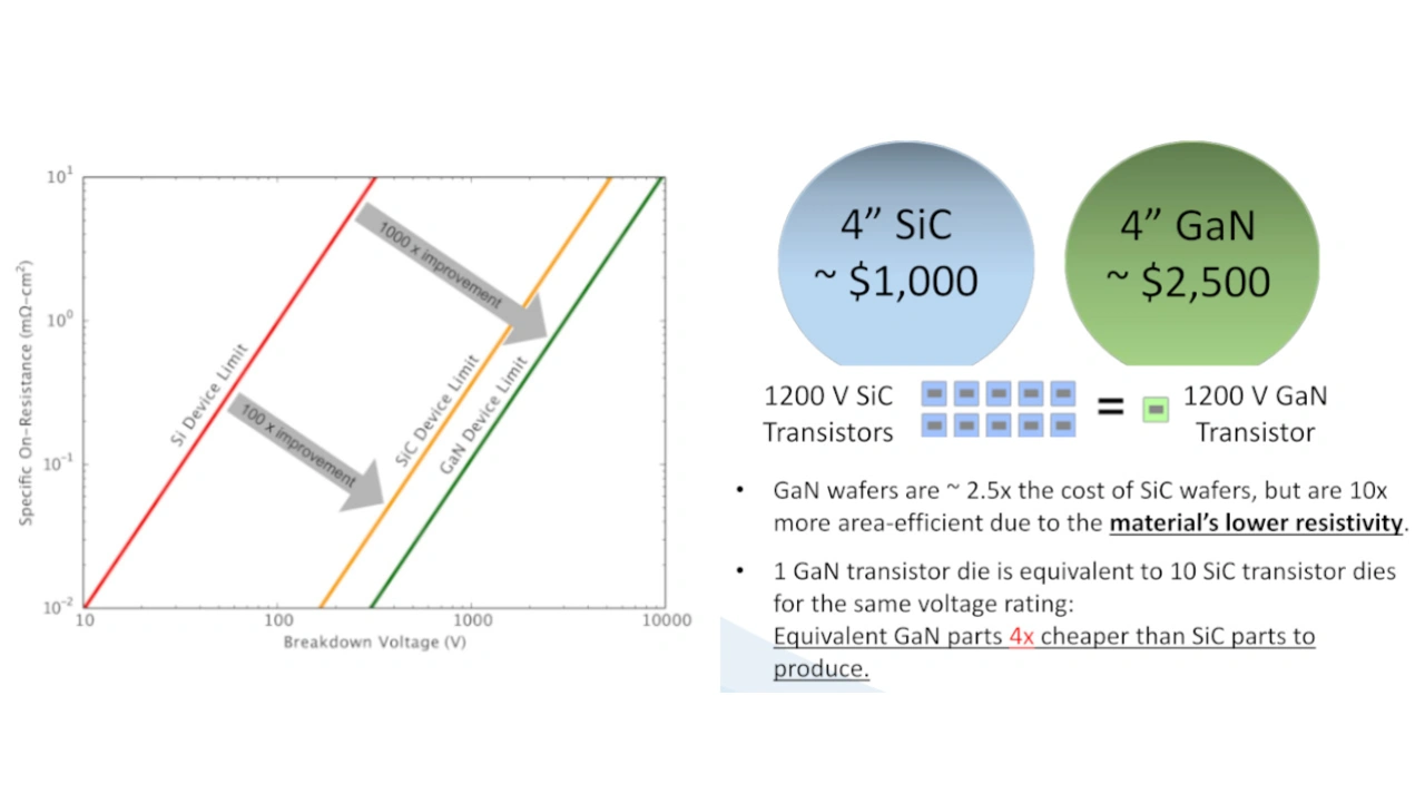 In einer Investorenpräsentation rechnet Odyssey Semiconductor vor, dass ein GaN-Substrat etwa 2,5-mal teurer ist als ein entsprechendes SiC-Substrat. Wegen des geringeren flächenspezifischen Widerstands kann ein vertikaler GaN-Transistor allerdings etwa zehnmal kleiner sein als ein äquivalenter SiC-Transistor. Damit sollte ein vertikaler GaN-Transistor viermal kostengünstiger sein als sein Pendant aus Siliziumkarbid (Bild 2).