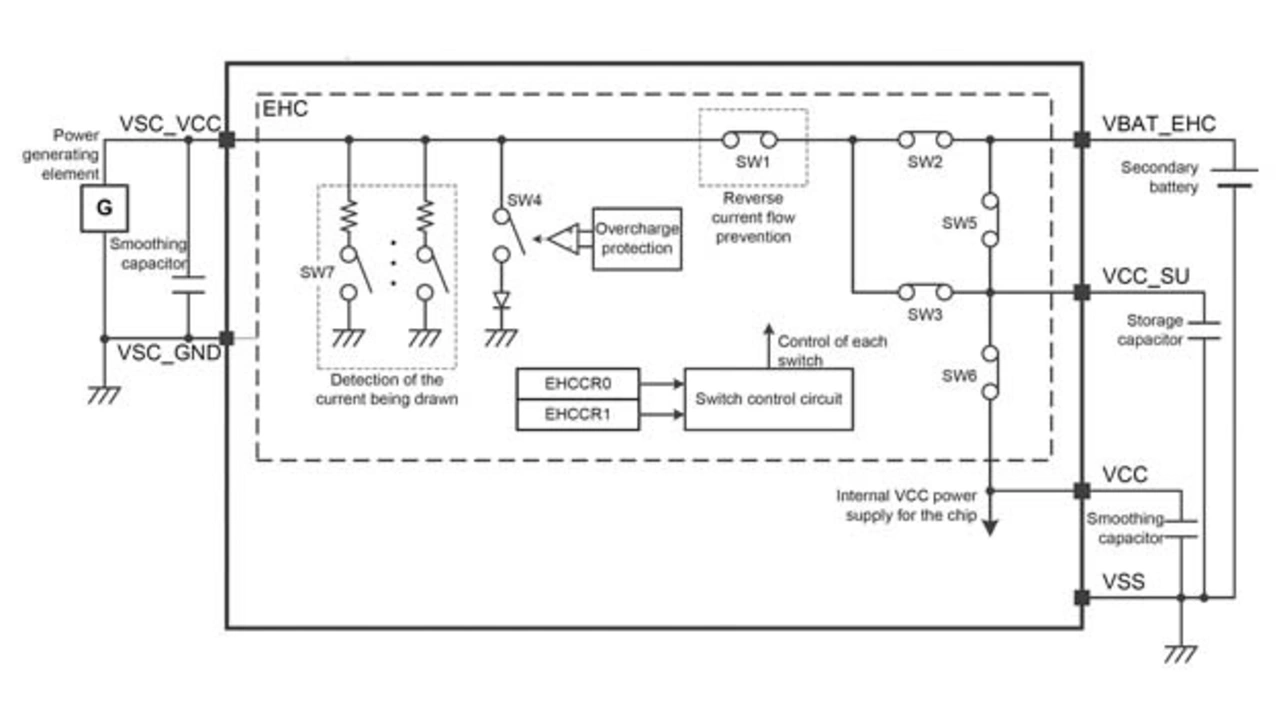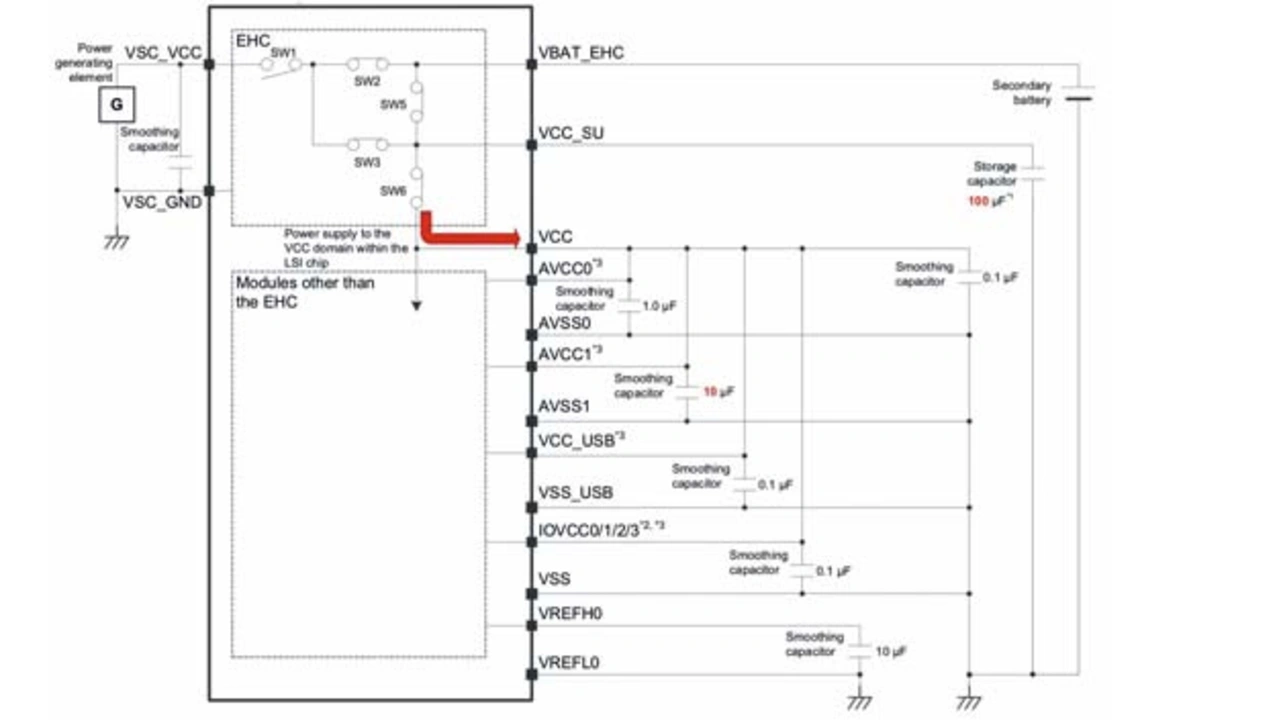 Dank des integrierten EHC machen die RE01-MCUs die Implementierung von Energy Harvesting zu einem eher routinemäßigen Vorgang. Entwickler müssen lediglich ein stromerzeugendes Element, wie zum Beispiel eine Solarzelle, ein TEG oder einen Schwingungsaufnehmer, direkt an die Pins VSC_VCC und VSC_GND der MCU anschließen. Wenn genügend Umgebungsenergie vorhanden ist, kann der EHC die MCU-Ausgangspins ansteuern, um eine Sekundärbatterie (VBAT_EHC), einen Speicherkondensator (VCC_SU) und andere externe Komponenten zu laden (Bild 3).