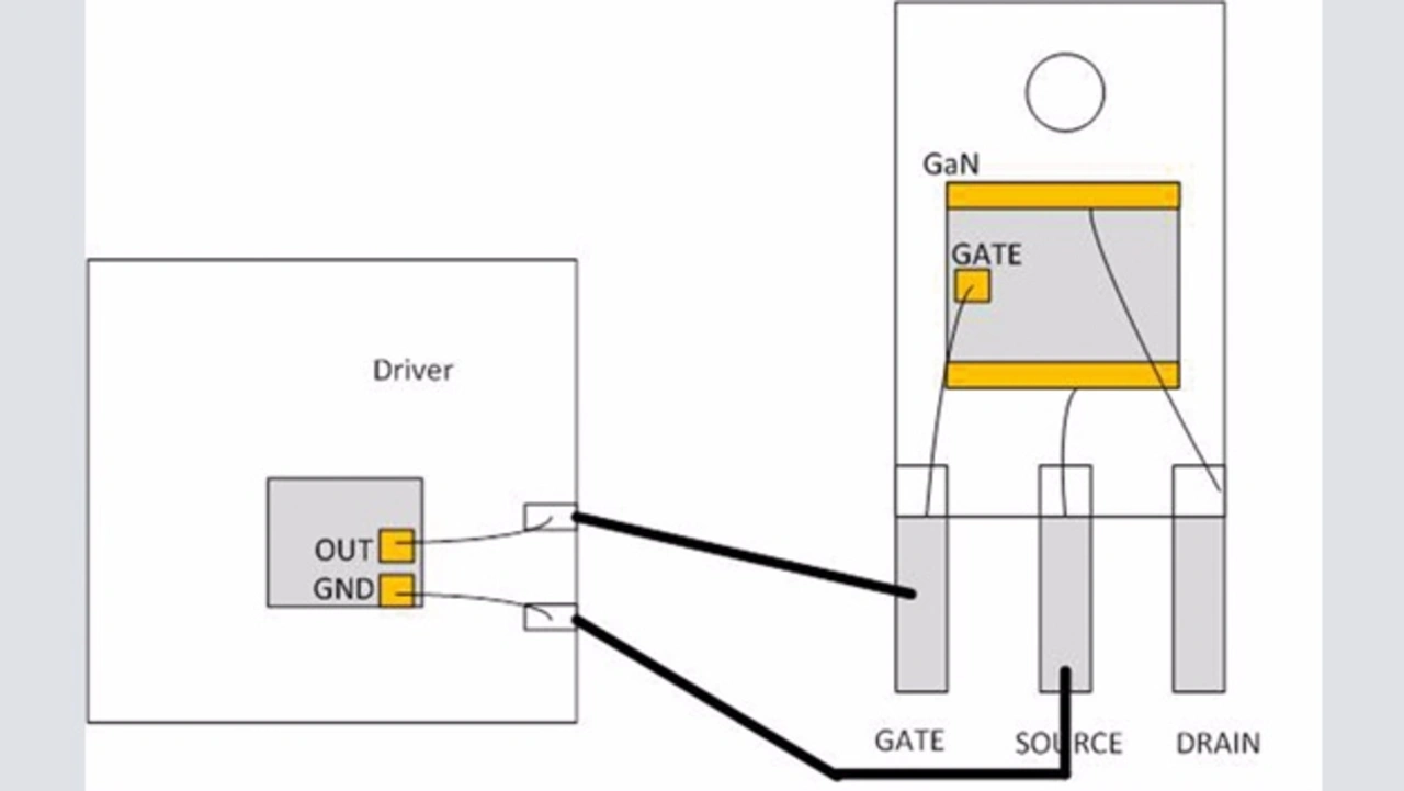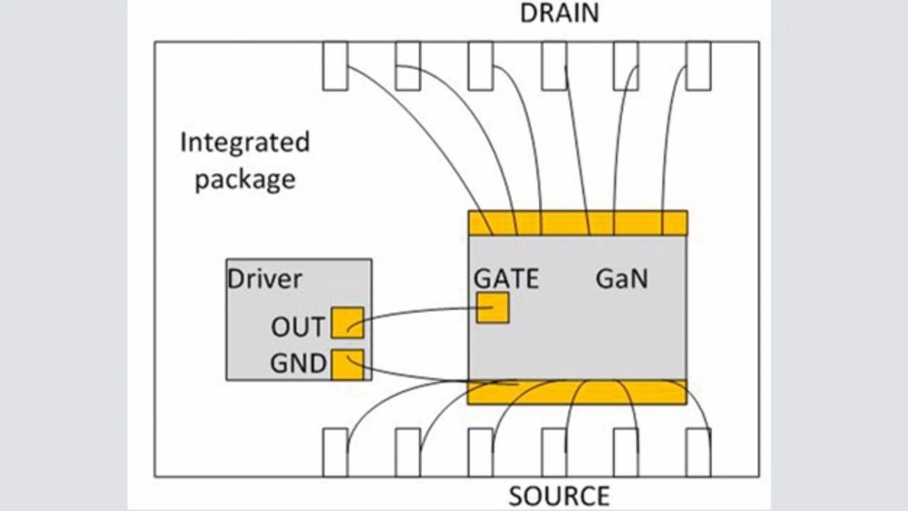 Durch Integrieren des GaN-Transistors mit seinem Treiber (Bild 1b) auf demselben Leadframe in nur einem Gehäuse entfällt die Common-Source-Induktivität, und die Induktivität zwischen Treiberausgang und GaN-Gate reduziert sich beträchtlich – ebenso wie die Induktivität der Masseverbindung des Treibers.