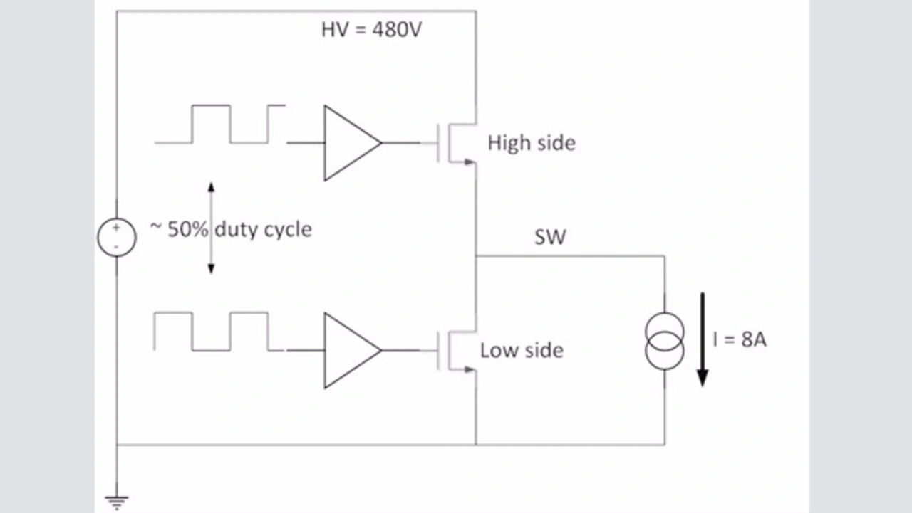 Um die Auswirkungen der parasitären Induktivitäten zu simulieren, wurde eine mit GaN-Transistoren vom Verarmungstyp (selbstleitend, normally on) bestückte Halbbrücke in der Direct-Drive-Konfiguration verwendet (Bild 2). Die Halbbrücke wurde als Tiefsetzsteller eingerichtet, mit einer Busspannung von 480 V, 50 % Tastverhältnis, 50 ns Totzeit (die Ausgangsspannung UOUT betrug 240 V) und einem Spulenstrom von 8 A. Das GaN-Gate wird abwechselnd direkt mit dem Ein- und Ausschaltpegel angesteuert. Die resistive Ansteuerung legt die Anstiegsgeschwindigkeit des GaN-Bausteins beim Einschalten fest, und eine Stromquelle emuliert eine induktive Last am Schaltknoten (SW) eines im nichtlückenden Betrieb arbeitenden Tiefsetzstellers.