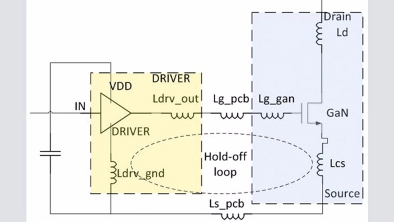 Abhängig von den Abmessungen des Gehäuses kann die Gate-Induktivität zwischen einigen Nanohenry bei einem kompakten oberflächenmontierbaren Gehäuse liegen (beispielsweise QFN-Gehäuse) und mehr als 10 nH bei einem bedrahteten Leistungsgehäuse (beispielsweise Bauart TO-220). Ist der Treiber zusammen mit dem GaN-FET auf demselben Leadframe integriert (Bild 1b), ist das GaN-Gate direkt an den Treiberausgang gebondet, wodurch sich die Gate-Induktivität auf weniger als 1 nH verringern kann. Das gemeinsame Gehäuse kann darüber hinaus die Induktivität der Treibermasse entscheidend reduzieren (von Ldrv_gnd + Ls_pcb in Bild 1aa auf Lks in Bild 1bb).