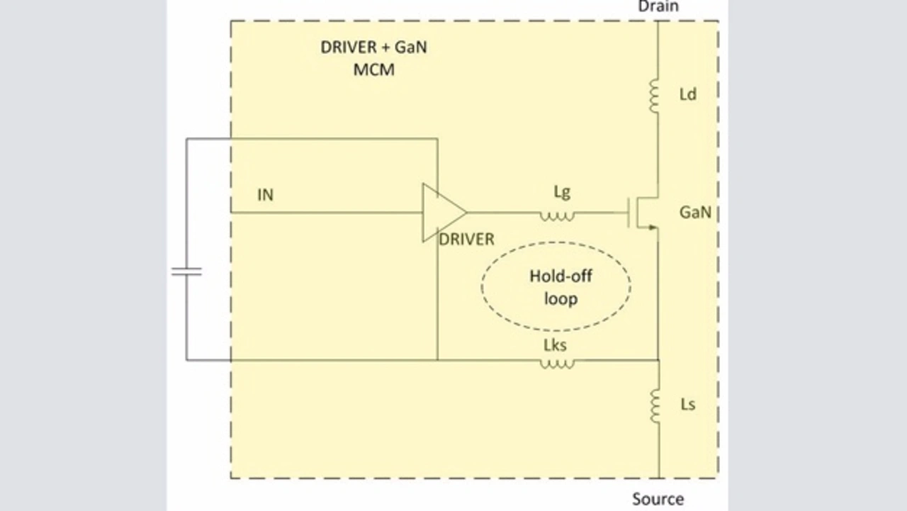 Bei dem in Bild 1bb gezeigten integrierten Gehäuse ist die Masse des Treibers per Bonddraht direkt mit dem Source-Pad des GaN-Chips verbunden. Diese Kelvin-Verbindung minimiert die Common-Source-Induktivität auf dem gemeinsamen Strompfad des Leistungs- und des Gate-Kreises, wodurch dieser Baustein ein wesentlich höheres di/dt erreichen kann. Selbstverständlich kann ein Kelvin-Source-Anschluss auch zu einem diskreten Gehäuse hinzugefügt werden. Dieses wird dadurch jedoch zu einem vom Standard abweichenden Gehäuse und außerdem muss man auf der Leiterplatte eine Leiterbahn vom Kelvin-Source-Anschluss zurück zum Treibergehäuse verlegen, was wiederum die Induktivität des Gate-Stromkreises erhöht.
