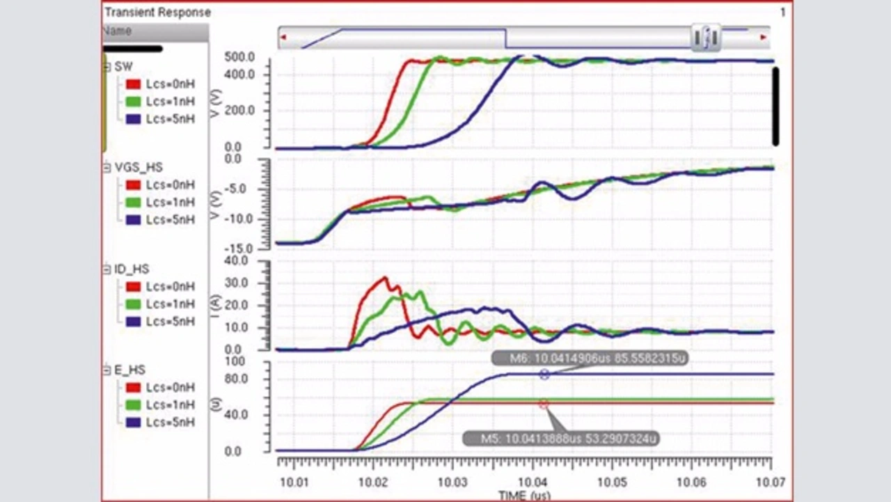 Die Induktivität des Gate-Stromkreises wirkt außerdem erheblich auf die Fähigkeit ein, den ausgeschalteten low-seitigen GaN-FET nicht durch induzierte Ströme wieder einzuschalten (Hold off). Wenn das Gate des low-seitigen Transistors auf der Abschaltspannung gehalten wird und der high-seitige Baustein einschaltet, lässt die Drain-Gate-Kapazität des low-seitigen Bausteins einen hohen Strom in das Gate des low-seitigen FETs fließen. Dieser Strom bewirkt, dass infolge der Induktivität des Gate-Stromkreises das Potenzial am Gate ansteigt. Bild 4 veranschaulicht dieses Phänomen bei etwa 10,02 µs. Wenn die Induktivität zunimmt, steigt die UGS des low-seitigen Bausteins immer weiter an, wodurch sich der Shoot-through-Strom erhöht (erkennbar ist dies an den Kurven zum high-seitigen Drain-Strom). Dieser Shoot-through-Effekt wiederum bewirkt, dass der Cross-Conduction-Energieverlust (E_HS) von 53 µJ auf 67 µJ ansteigt.