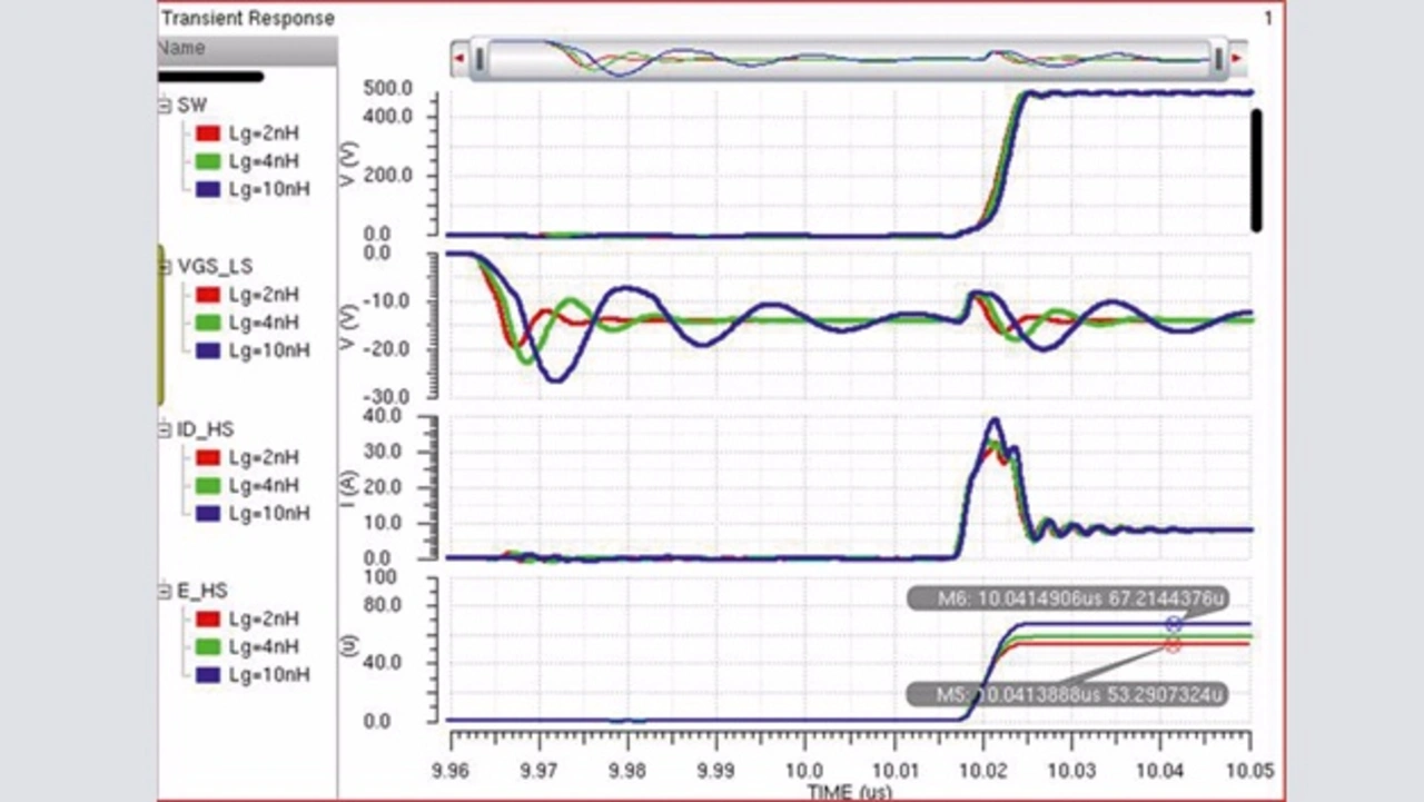 Vergrößert sich die Induktivität des Gate-Stromkreises, nimmt dieser Gütefaktor zu und der Stromkreis neigt stärker zum Schwingen. Simulieren lässt sich dieser Effekt mit einem Pull-down-Widerstand von 1 Ω zum Abschalten des low-seitigen GaN-FET (siehe Bild 4 bei 9,97 µs). Dabei wird die Induktivität des Gate-Stromkreises zwischen 2 nH und 10 nH variiert. Bei 10 nH schwingt die low-seitige Gate-Source-Spannung UGS stark ins Negative über, sodass das Gate des GaN-Transistors stark belastet wird. Bekanntermaßen führt eine solche Überlastung bei FETs jeglicher Art zu Zuverlässigkeitsproblemen.