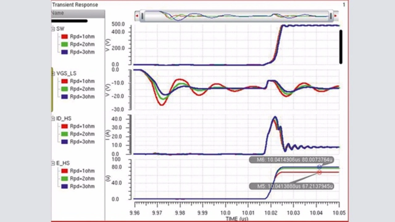 Eine Möglichkeit, die starke Belastung des Gates zu senken, besteht darin, den Wert des Pull-down-Widerstands zu vergrößern, was gemäß Gleichung (1) die Güte des LRC-Schwingkreises verringert. Bild 5 zeigt Simulationen mit einer Gate-Stromkreises-Induktivität von 10 nH und einem von 1 Ω bis 3 Ω variierten Pull-down-Widerstand. Bei einem Wert von 3 Ω wird zwar das Unterschwingen am Gate auf wenige Volt unterhalb der negativen Bias-Spannung begrenzt, aber dafür verschlechtert sich die Hold-off-Fähigkeit mit dem Resultat eines höheren Shoot-through-Stroms (erkennbar an den Kurven zum Drain-Strom). Die E_HS-Kurven lassen einen zusätzlichen Verlust von 13 µJ pro Schaltzyklus erkennen, was eine Zunahme um fast 60 % gegenüber den 53 µJ bedeutet, die bei einer Gate-Stromkreis-Induktivität von 2 nH und einem Pull-down-Widerstand von 1 Ω entstehen (Bild 4).