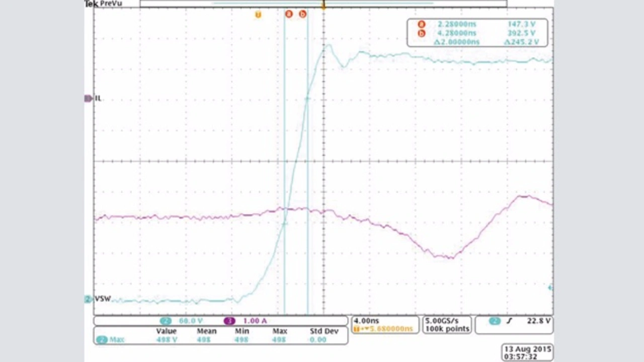 Bild 6 zeigt das Oszillogramm, das beim Schalten einer Halbbrücke aus zwei GaN-Bausteinen in einem 8 mm x 8 mm großen QFN-Gehäuse mit integriertem Treiber aufgezeichnet wurde. Kanal 2 zeigt den Schaltknoten, wenn der high-seitige Baustein mit einer Anstiegsgeschwindigkeit von 120 V/ns und einer Busspannung von 480 V hart geschaltet wird. Durch das optimierte Gehäuse mit integriertem Treiber und das Leiterplatten-Layout wird das Überschwingen auf weniger als 50 V begrenzt. Die Kurve wurde mit einem 1-GHz-Oszilloskop und entsprechenden Tastköpfen aufgezeichnet.