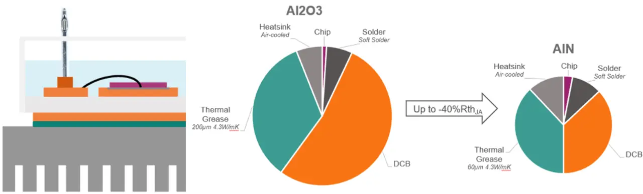 Durch die Integration eines AlN-Keramiksubstrats in ein SiC-Leistungsmodul ohne Bodenplatte entstehen zahlreiche Vorteile gegenüber herkömmlichen Lösungen, insbesondere in Bezug auf die thermische Leistung. So bietet AlN eine überlegene Wärmeleitfähigkeit, die sieben- bis achtmal höher ist als die des weitverbreiteten Aluminiumoxids (Al2O3).