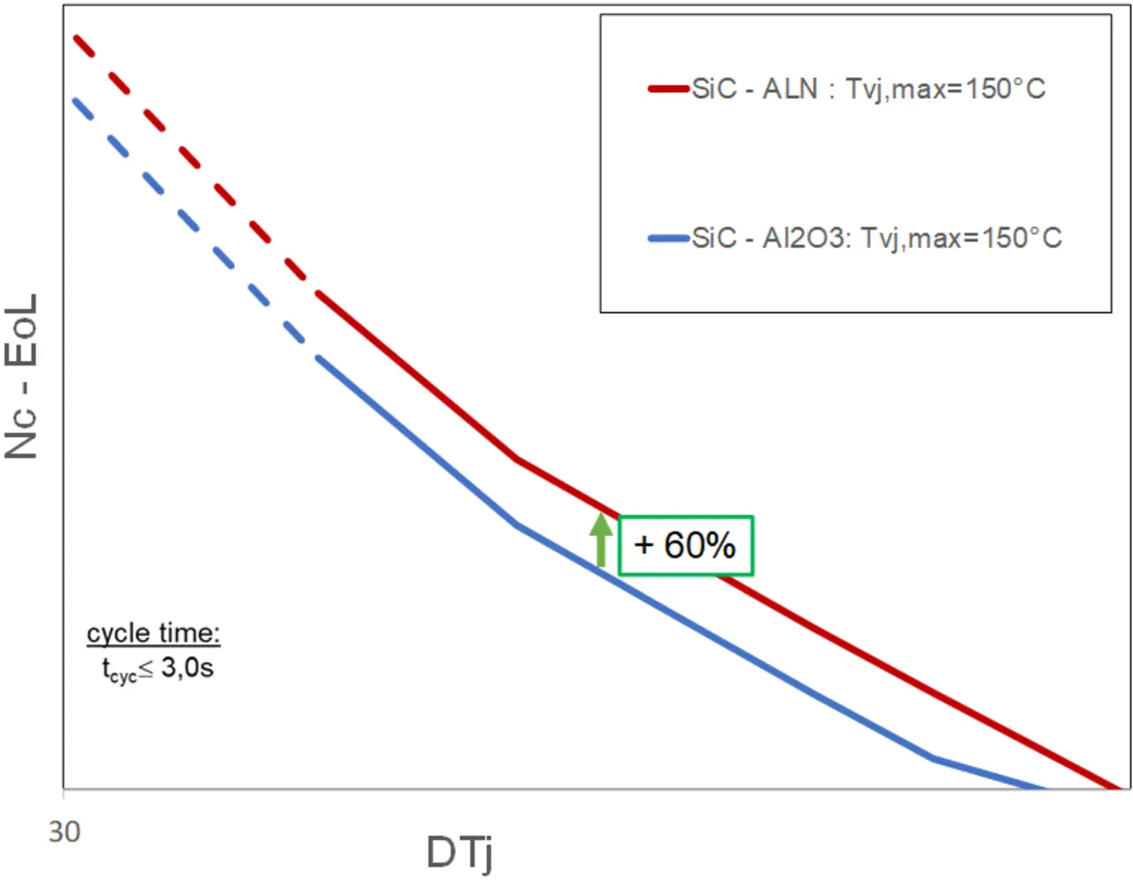 Zur Veranschaulichung kann man sich ein vereinfachtes Praxisbeispiel vorstellen: einen Solarwechselrichter, der einen Zyklus pro Tag durchläuft – von Sonnenaufgang bis Sonnenuntergang. Bei gleichen Betriebstemperaturen für beide Designs und unter Berücksichtigung der Abhängigkeit von der Einschaltdauer ton beträgt die Lebensdauer des Al2O3-Designs etwa 16 Jahre, während das AlN-Gegenstück etwa 26 Jahre durchhält.
