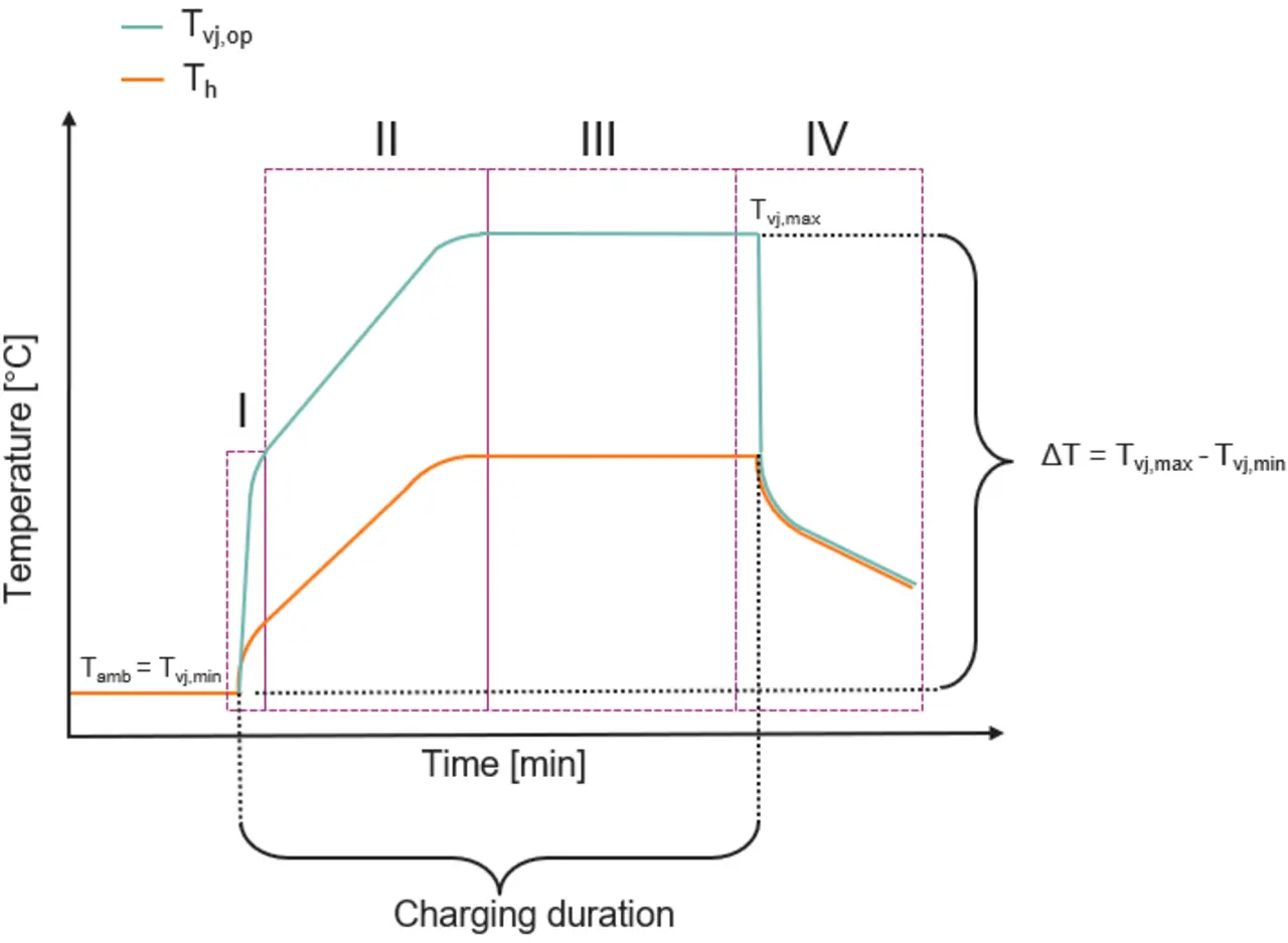 Das Ladeprofil, das insbesondere durch die Höhe und Schwankung von Spannung und Strom bestimmt wird, wirkt sich direkt auf das Temperaturprofil des Leistungsmoduls aus. Überdies tragen die Ladedauer und die Anzahl der Zyklen zur gesamten thermischen Belastung der Bauteile bei und beeinflussen daher die Alterung der Module durch thermische Zyklen. Die durch einen Ladezyklus verursachte Belastung lässt sich wie folgt aufteilen (Bild 4):