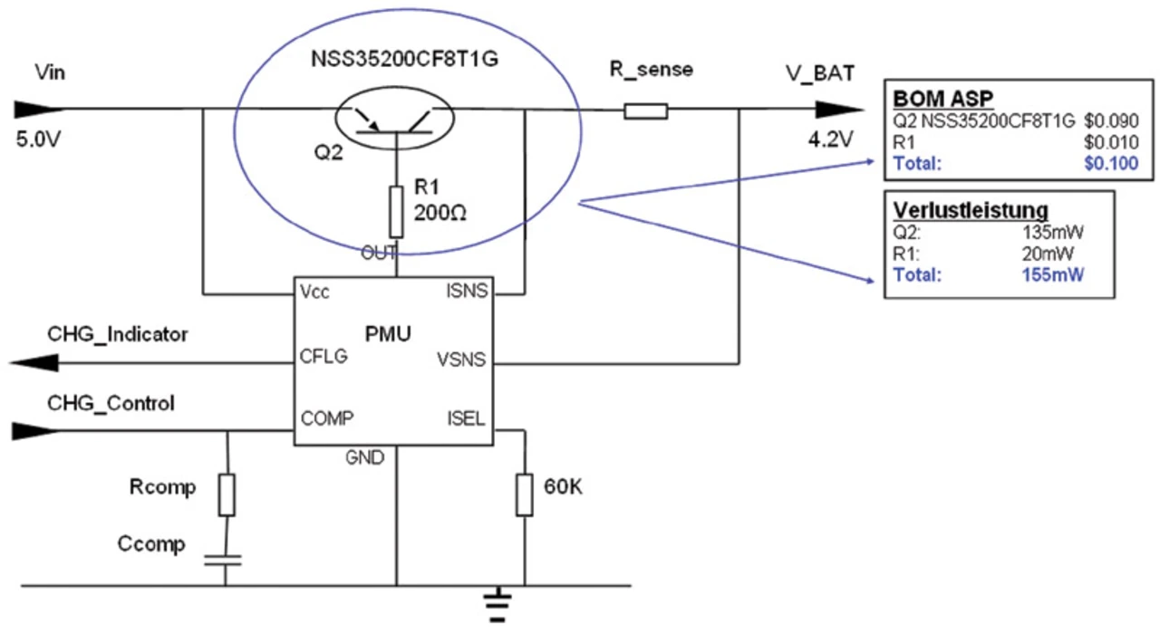 Gerade in der Konsumelektronik kann ein Cent hin oder her bei den Materialkosten über den Erfolg eines Produktes entscheiden. Doch wo lässt sich etwas einsparen? Eine Möglichkeit besteht darin, in der Akkuladeschaltung den relativ teuren MOSFET durch einen kostengünstigen Bipolartransistor mit niedriger Sättigungsspannung zu ersetzen.
