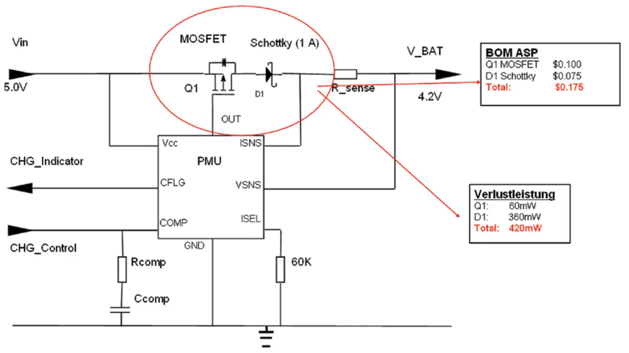 Bild 1 zeigt eine Ladeschaltung in einem tragbaren Produkt, bestehend aus dem Leistungstransistor Q1 (MOSFET, 2 A, 20 V Durchbruchsspannung, Gehäuse TSOP6) und der Schottky- Diode D1. Die gesamte Steuerung für das Laden des Lithium-Ionen-Akkus ist in einer PMU eingebettet. Der Control-Pin der PMU geht auf High, um Q1 einzuschalten, der Ladestrom sei auf 1 A eingestellt. Die Schottky- Diode D1 in Serie ist nötig, um einen eventuellen Rückstrom aus dem Akku zu sperren. Die typische durch die Bauteile Q1 und D1 aufgenommene Leistung errechnet sich folgendermaßen: