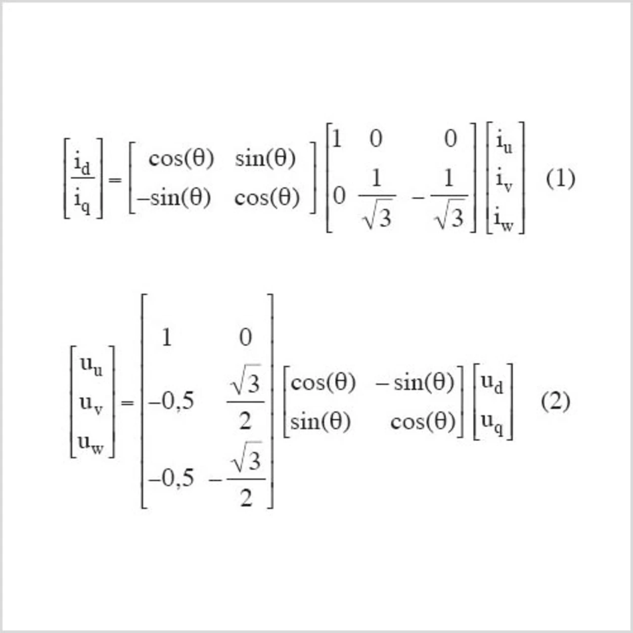 Zwar verlässt sich die Rotor-FOC auf Größen, die auf das rotierende dq- Koordinatensystem bezogen sind, doch handelt es sich bei den gemessenen Signalen um die AC-Motorphasenströme iu, iv und iw. Zur Erfassung der Größen id und iq müssen diese in das rotierende dq-Koordinatensystem übersetzt werden (1). Die AC-Referenzwerte uu, uv und uw erhält man auf umgekehrte Weise (2).