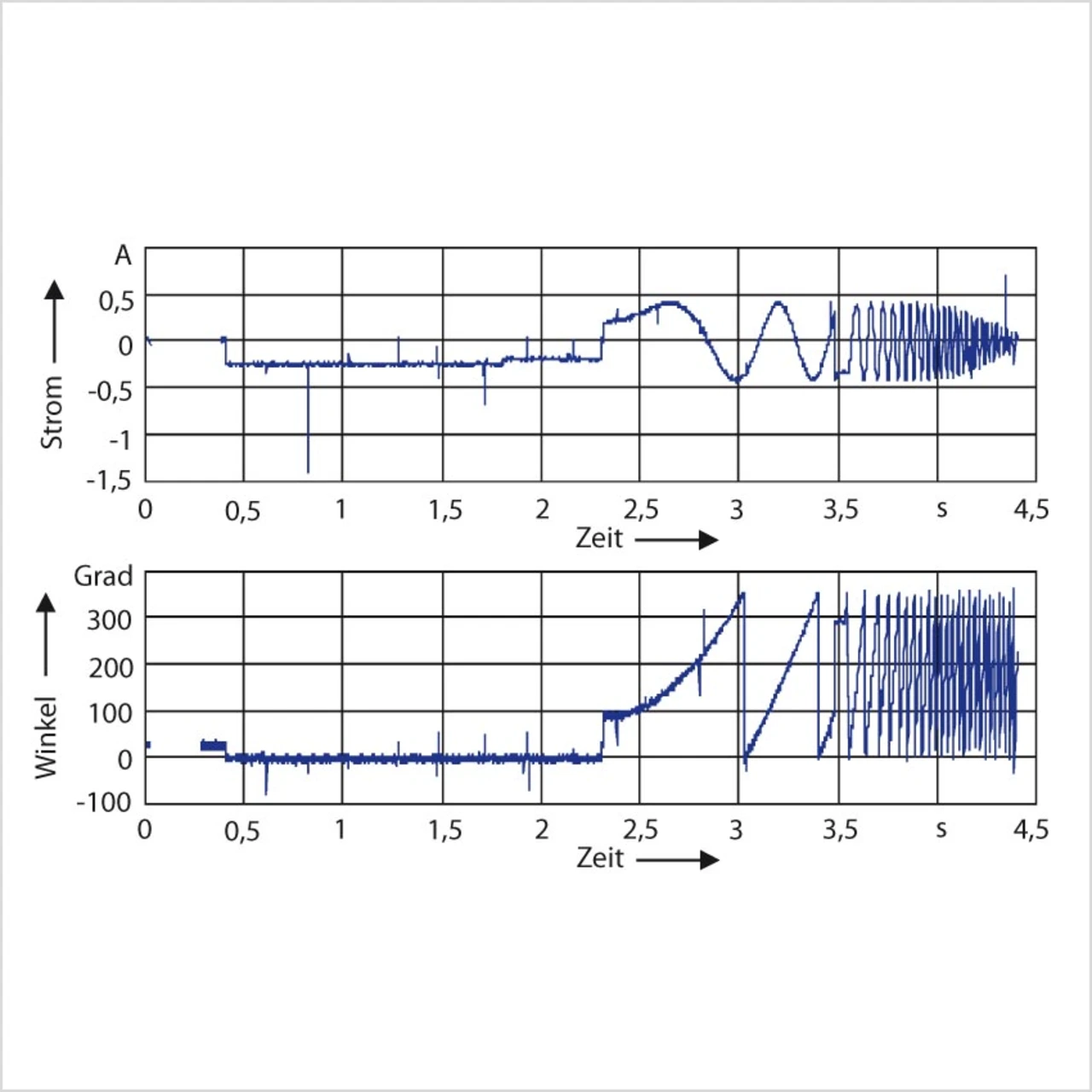 Bewegt sich der Motor gemäß der beobachteten Drehzahl in umgekehrter Richtung, muss der Regler den Motor erst abbremsen, ehe er von Drehzahl Null in die richtige Richtung starten kann. Wird festgestellt, dass der Motor stillsteht, kann auf die Bremsstufe verzichtet werden. Bild 4 zeigt experimentell ermittelte Signalverläufe des Starts bei einem rückwärts drehenden Ventilator. Die erste Stufe ist der anfängliche Bremszeitraum. Als nächstes folgt eine Park-Funktion von zwei Sekunden Dauer. Dann ist ein offen geregelter Hochlauf der Drehzahl erkennbar, der ungefähr eine Sekunde dauert, und als letztes schließt der Regler die Positions- und Drehzahlkreise, und der Motor beschleunigt hoch bis zur Solldrehzahl.