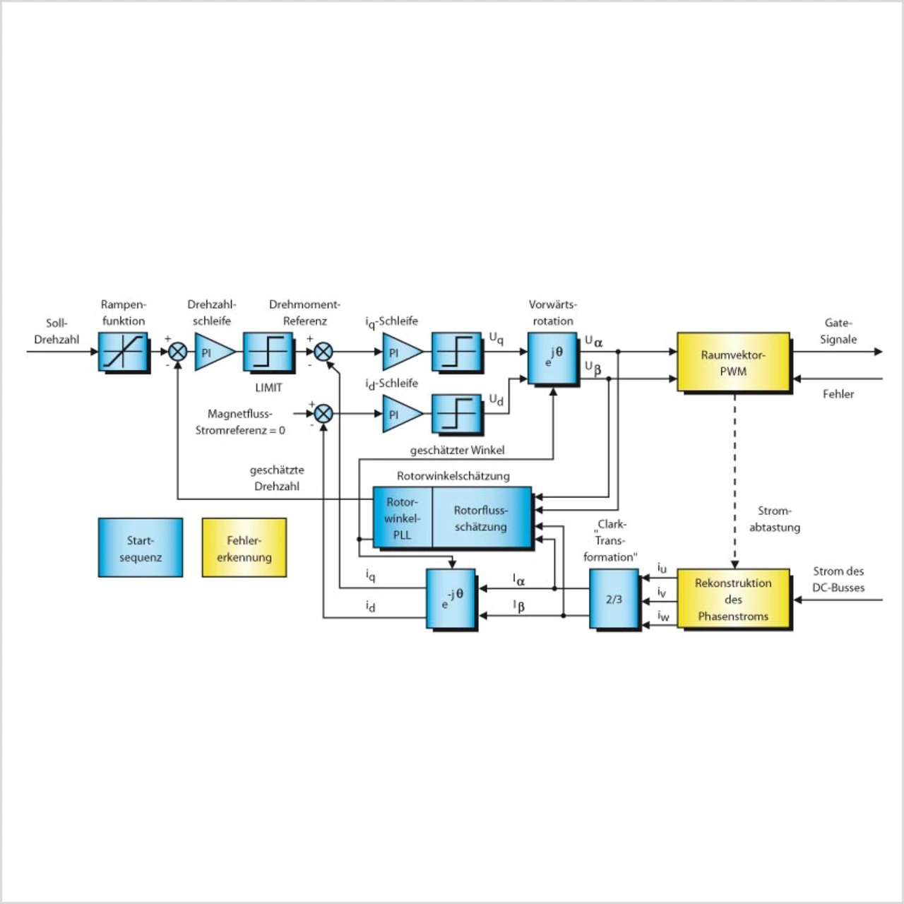 Bild 1 zeigt die Blockschaltung eines FOC-Reglers. Zur Implementierung einer auf den Rotor bezogenen FOC werden alle Motorvariablen in das rotierende „dq“-Koordinatensystem transformiert, das auf die Rotorfeldposition ausgerichtet ist. Die Motorfluss- und die Drehmomentregelung des Motors bestehen aus zwei Rückkopplungsschleifen: einem Längsstrom- Regelkreis (id) und einem Querstrom- Regelkreis (iq). Der Regelkreis für die Drehzahl stellt den Referenzeingang für die Regelung des Querstroms zur Verfügung, während der Referenzwert für den Strom in Längsrichtung Null ist. Diese Vorgehensweise zur Regelung erhöht den Motorwirkungsgrad auf ein Maximum, weil der Motorstrom um 90° zum Rotorfeld versetzt ist. Alle drei Regelkreise setzen Proportional- und Integral- Regler (PI-Regler) ein. Der Drehzahlregelkreis regelt die mechanische Geschwindigkeit durch Errechnen der Motordrehzahl, die erforderlich ist, um den Drehzahlfehler auf Null zu halten. Das Integral-Rückkopplungsglied zwingt den statischen Fehler auf Null, da bereits ein geringfügiger Fehler eine Änderung des Ausgangswerts erzwingen würde. Das proportionale Rückführglied reagiert unmittelbar auf Fehlerveränderungen und bestimmt dadurch das Dynamikverhalten des Regelkreises. Der Wert des Integralglieds ist sowohl nach oben als auch nach unten begrenzt, um ein Torsionsspiel der Integrationsglieder während Spannungssprüngen zu verhindern. Die Ausgänge sämtlicher PIKompensatoren sind auf Nenndaten begrenzt, damit ein Schutz des Systems gewährleistet ist.