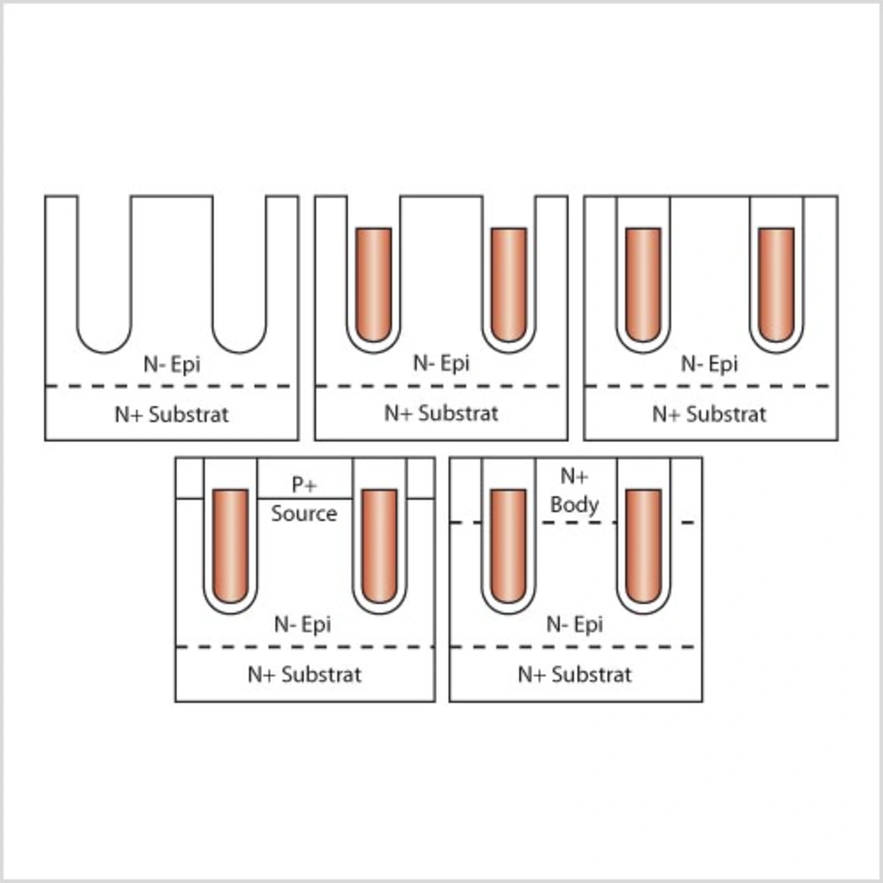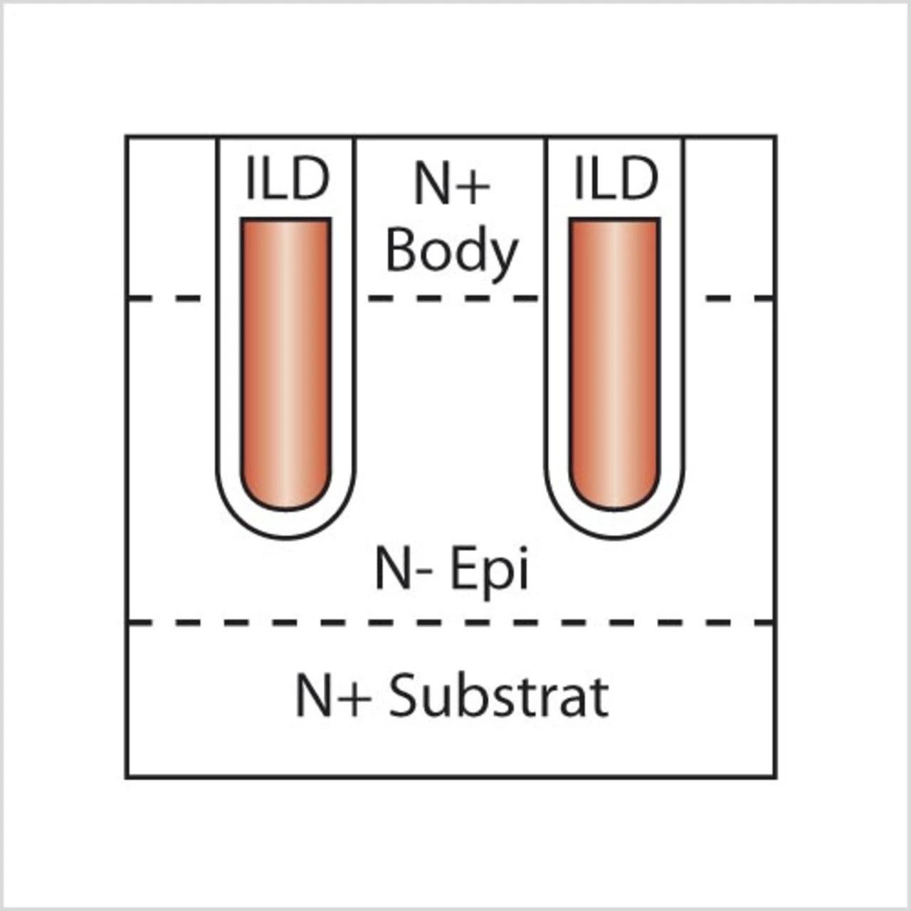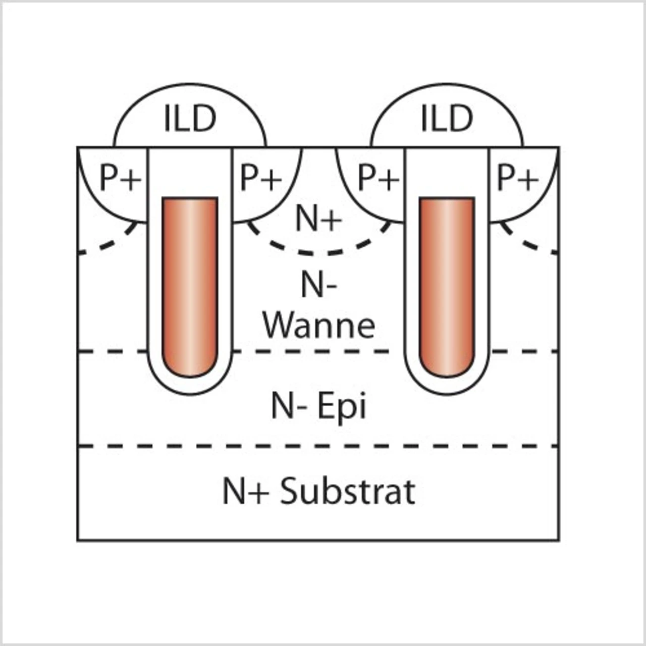 Bild 1 zeigt ein herkömmliches Design mit einer N+-Body-Maske, die mit dem Trench abgestimmt ist. Die dielektrische Isolationsebene (ILD) zwischen Source-Metall und dem Polysilizium- Gate überlagert Teilbereiche der flachen Oberfläche des P+- Source-Bereiches. Daher wird der minimale Zellenabstand der herkömmlichen, selbstabgleichenden Elementestruktur limitiert durch den Kontaktabstand der Oberflächen-ILD-Ebene sowie durch die Möglichkeit, kleine Bereiche der N+-Body- und P+- Source-Bereiche abzubilden und zu justieren. Dieser Nachteil lässt sich durch einen speziellen Bauelemente- Aufbau umgehen (Bild 2).