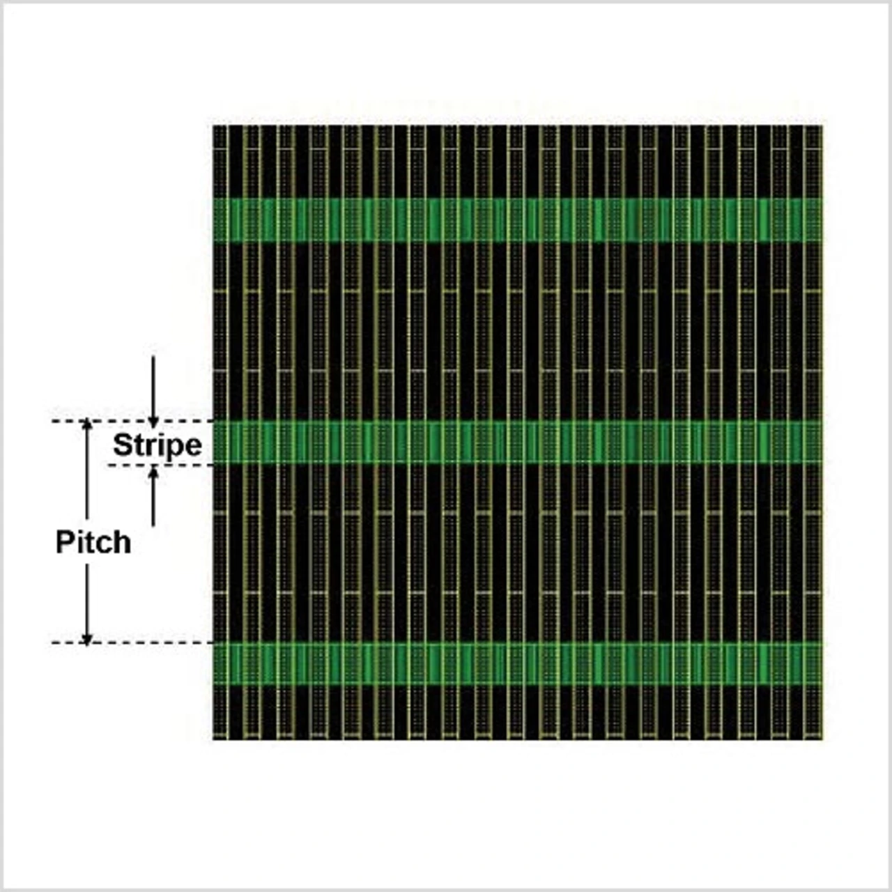 Dieses sich wiederholende Streifendesign wurde optimiert, um eine robuste Lawinenenergie-Festigkeit aufweisen zu können. Die wichtigsten Variablen waren die N+-Body-Tiefe, die Breite der Streifen und der sich wiederholende Abstand (Pitch). Bild 9 zeigt diese Definitionen grafisch auf.