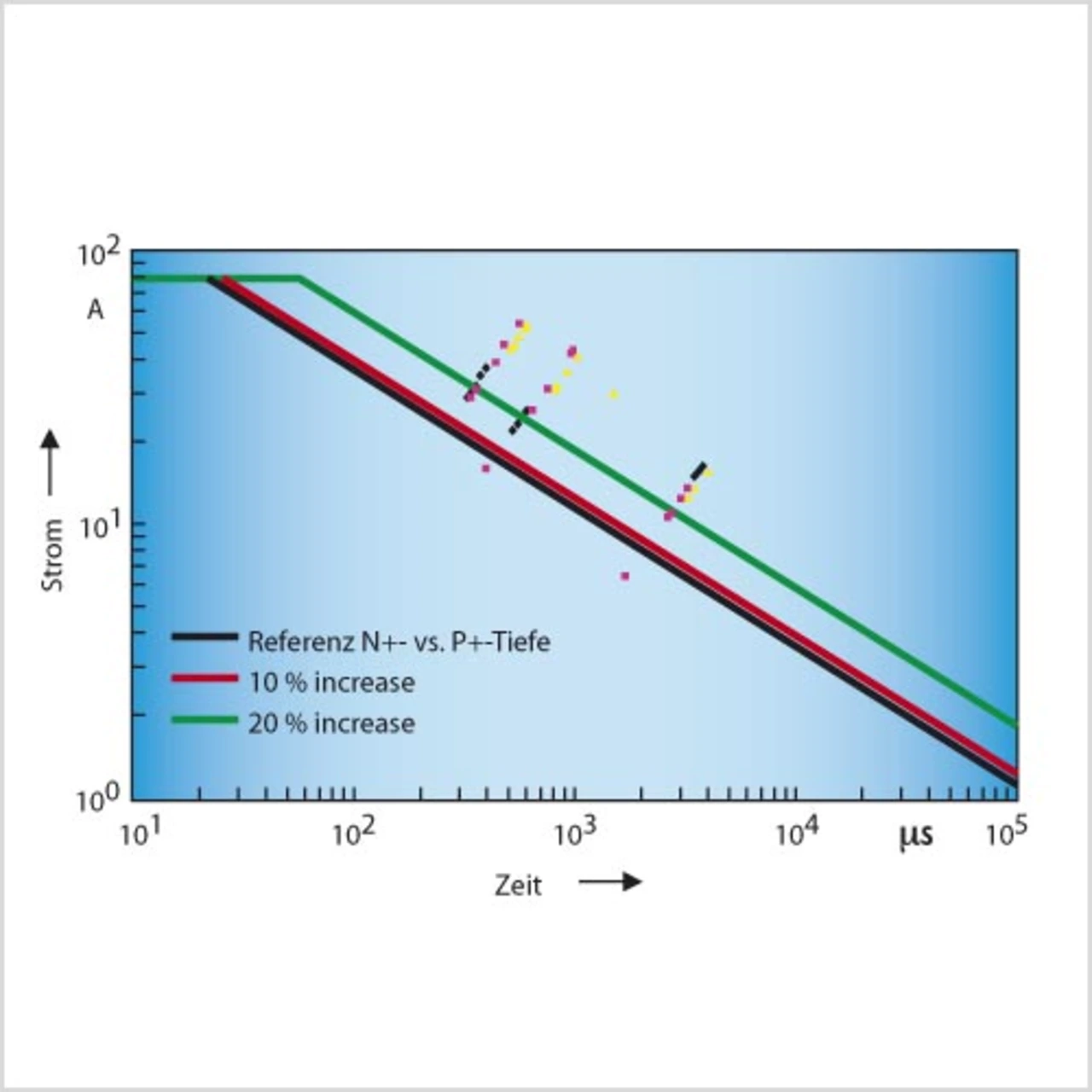 Im nächsten Schritt wurden die Breite und der Abstand des N+-Body untersucht. Dabei kamen sehr unterschiedliche sich wiederholende Abstände zum Einsatz, und zwar von 40 µm bis hinunter zu 4 µm. Bei Abständen von mehr als 20 µm ergab sich nur eine geringe Stromtragfähigkeit. Es war klar erkennbar, dass alle Fehler die gleiche Handschrift aufwiesen (Bild 11).