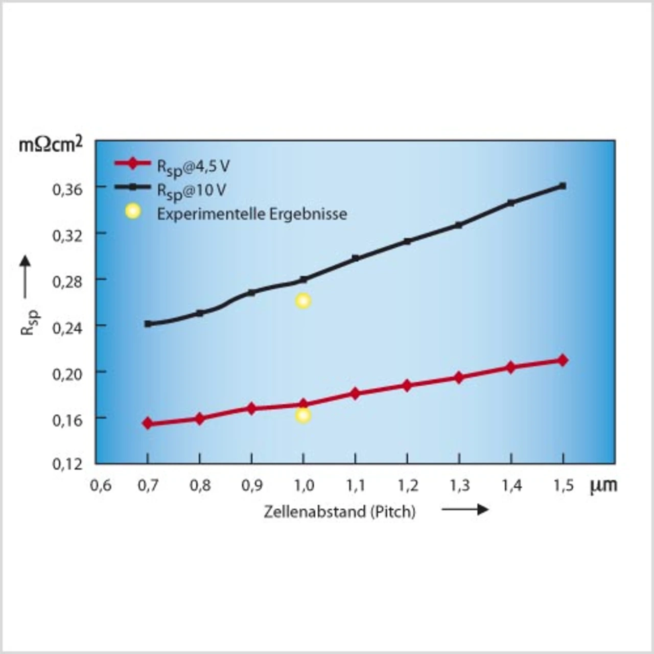 Für die neuesten tragbaren 30-V-Applikationen wurde ein neuer P-Kanal- Trench-Transistor mit einem Pitch von 1 µm entwickelt. Die neue Trench- Struktur bietet einen verbesserten Durchlasswiderstand bei trotzdem sehr guten UIS-Eigenschaften und einer ausgezeichneten Robustheit. Die Sperrspannung liegt bei 30 V bei einem Gatespannungs-Nennwert von 25 V und einem niedrigen spezifischen Durchlasswiderstand von nur 17 mΩmm2.