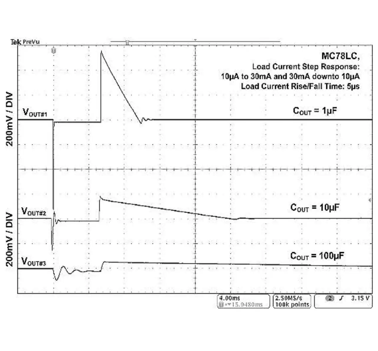 Bild 1 beschreibt, wie sich Über- und Unterschwingen solcher Regler bei Lasttransienten eingrenzen lassen: Der Ausgangskondensator COUT wird von 1 µF auf 100 µF erhöht. Dabei verringert sich zwar die Amplitude des Transienten, die Einschwingdauer verlängert sich jedoch. Bei einem großen Ausgangskondensator kommt noch hinzu, dass eine externe Verpolschutzdiode im System erforderlich ist, um den Regler vor übermäßigem Rückstrom zu schützen.