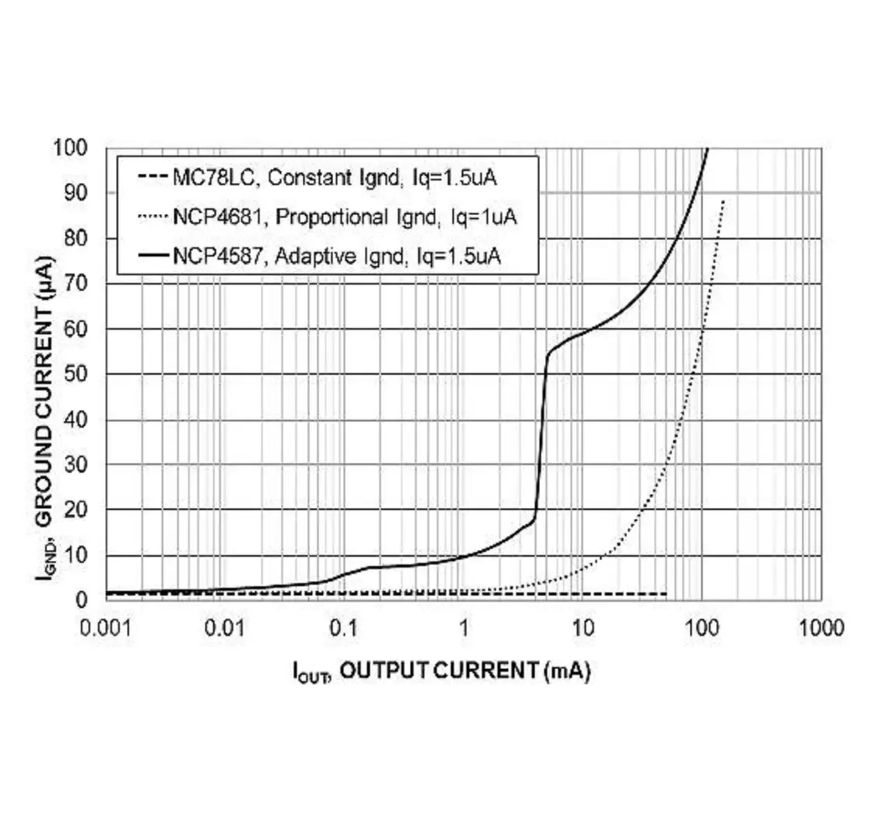 So gibt es verschiedene Arten von LDOs mit ultraniedrigem IQ. Sie basieren auf verschiedenen Techniken und weisen unterschiedliche dynamische Leistungscharakteristika auf: LDOs mit konstantem Arbeitspunkt (Bias), mit proportionalem Arbeitspunkt sowie mit adaptivem Arbeitspunkt. Traditionell verwenden CMOS-Linearregler wie der »MC78LC« von ON Semiconductor einen konstanten Arbeitspunkt, wobei der Strom über die Masse (GND) über dem Ausgangsstrombereich relativ konstant bleibt. Solche Bausteine eignen sich für batteriebetriebene Anwendungen mit weniger hohen Leistungsanforderungen. Ihr Hauptnachteil ist die relativ schlechte dynamische Leistungsfähigkeit in Bezug auf Last- und Netztransienten, die Störspannungsunterdrückung (PSRR, Power Supply Rejection Ratio), Ausgangsrauschen etc. lesen.