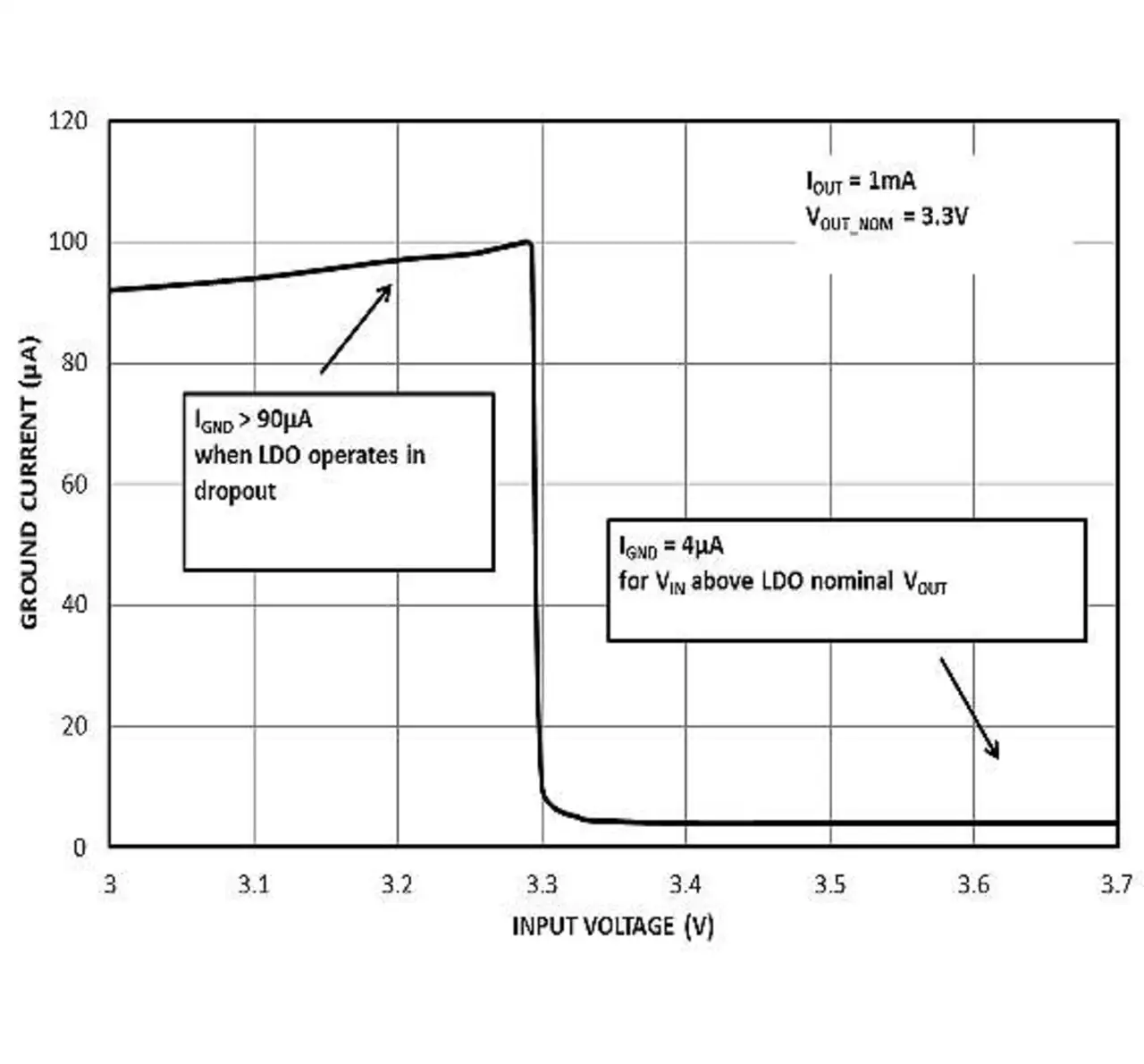 Bild 3 verdeutlicht dies. Im Dropout-Bereich beginnt der LDO bis zu 100 µA Strom zu ziehen.