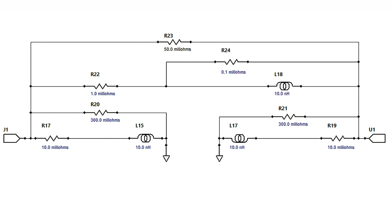 Die Schaltung zur Erzeugung des Referenz-S-Parameters wurde auf Basis von Bild 3 und mit empirischen Experimenten entwickelt. Im Beispiel können R17 und L15 den Widerstand und die Induktivität im Leistungspfad darstellen. Simulationstools wie HyperLynx LineSim von Siemens können S-Parameter dieser Struktur schnell generieren. Dieser Prozess lässt sich mit Python auch komplett automatisieren. Dadurch kann erreicht werden, dass Prozesse standardisiert und immer gleich ablaufen.