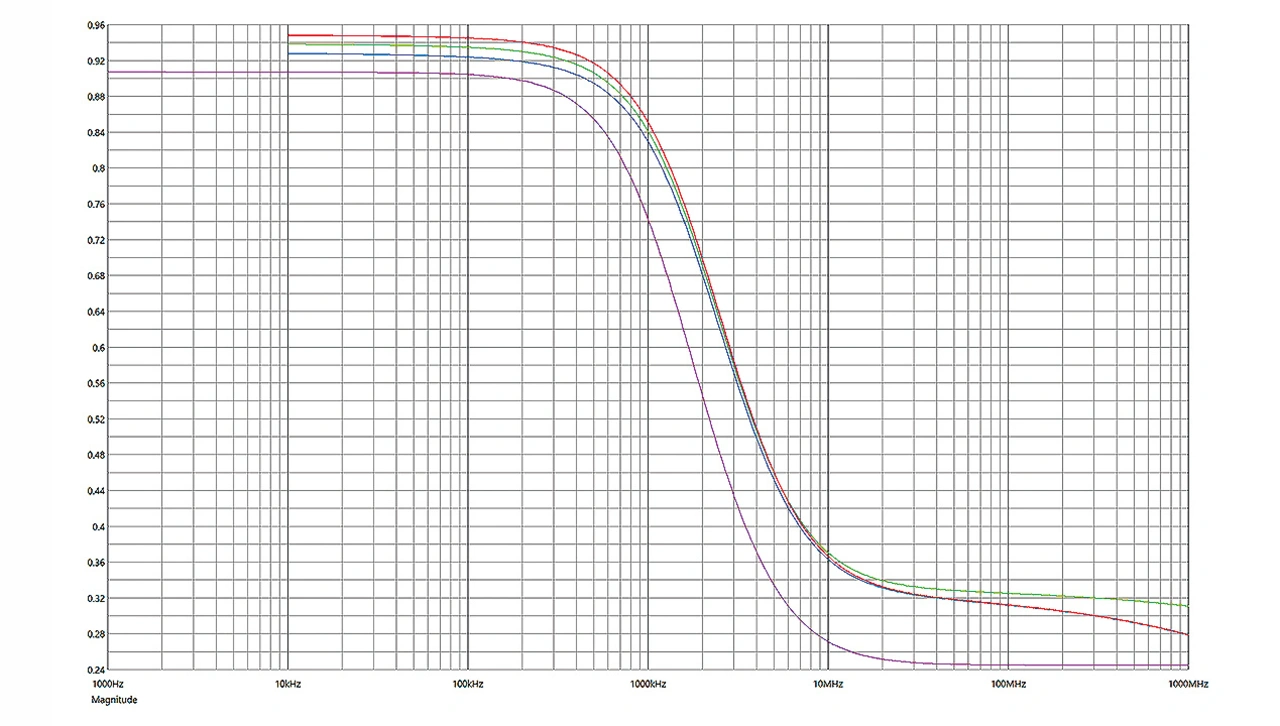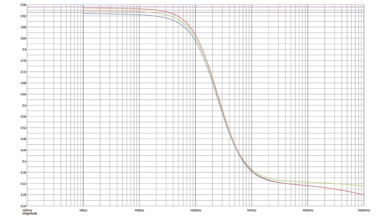 Das Diagramm (Bild 4) wurde von einem Power-Modul mit drei parallelen IGBTs erzeugt. Nach Anpassung der Parameter in der Referenzschaltung und Einbeziehung der drei S-Parameter in ein und demselben Diagramm kann überprüft werden, ob die Referenz-parameter überschritten werden. In Bild 4 über- oder unterschreitet keiner der Bauteil-S-Parameter den Referenz-S-Parameter (pink). Somit ist ohne weitere Simulation gewährleistet, dass die Basisparameter in Bezug auf die Absolutwerte ausreichend sind. Die Werte liegen in einem Bereich hoher Sicherheit.