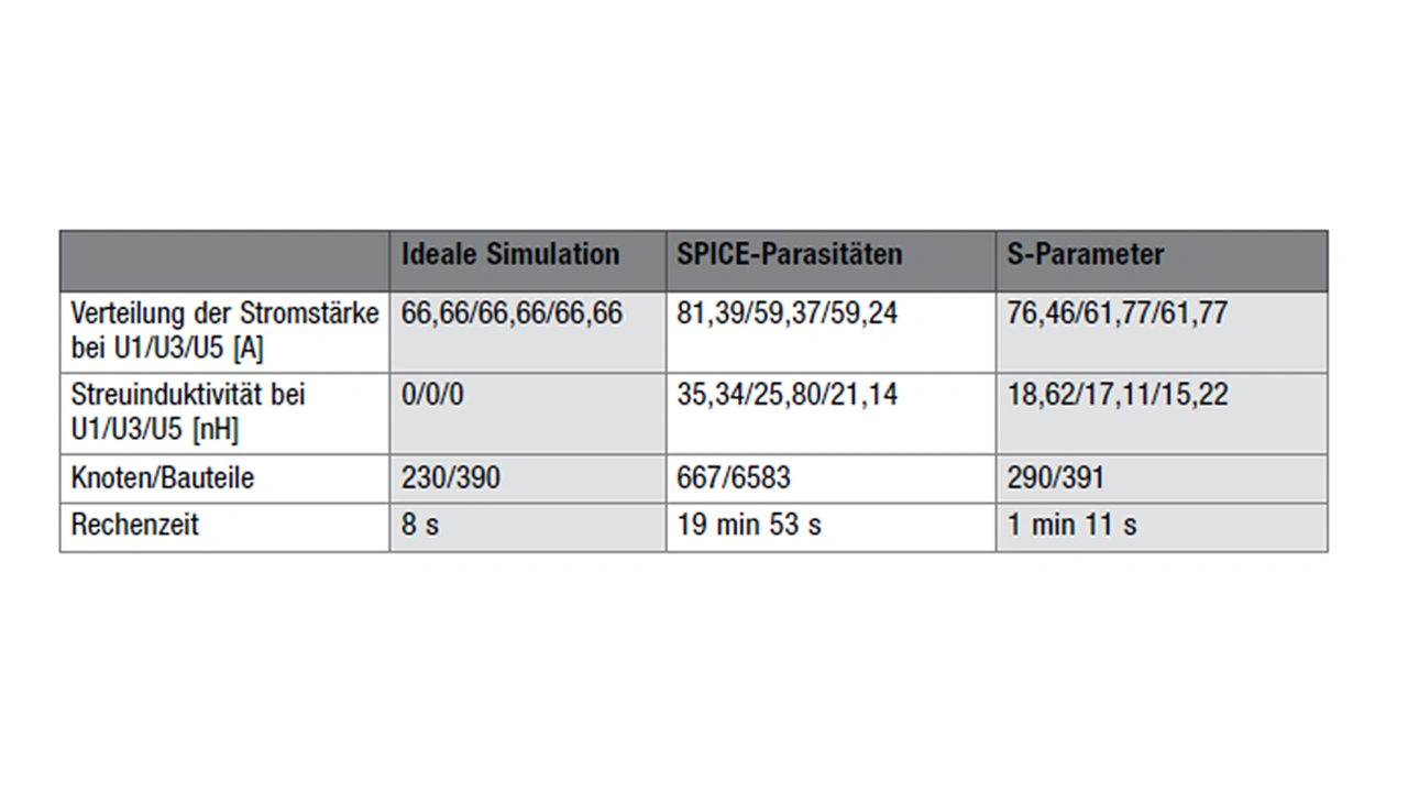 Im Aufsatz »Enable S-Parameters for Power Modules« [5] wurde bereits die Verwendung eines S-Parameters für die Zeitbereichs-simulation beschrieben. Wie in der Tabelle zu erkennen, dauert die Simulation mit S-Parameter trotzdem noch zehnmal länger als die ideale funktionelle Simulation ohne Substratparasitäten.