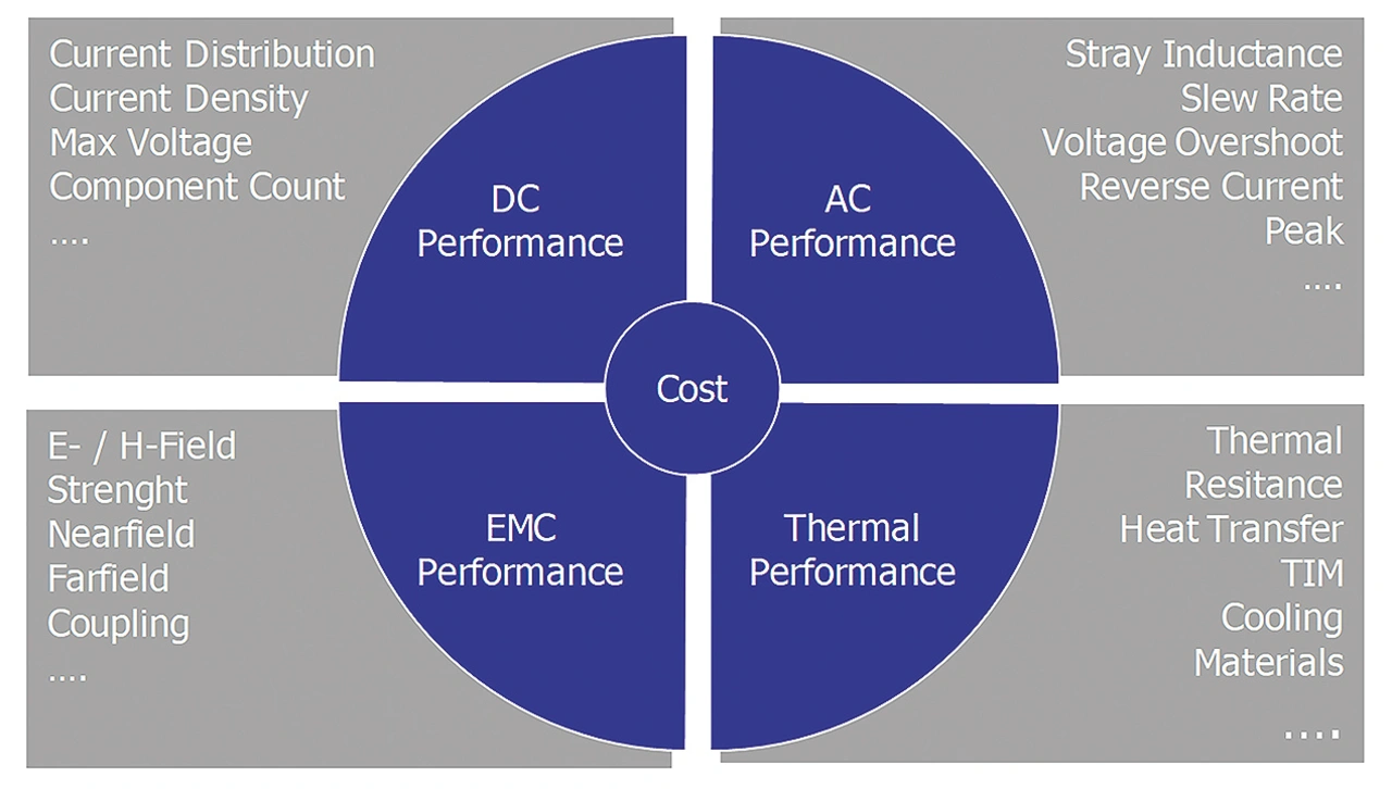 Beispielsweise wirkt sich eine einfache Änderung der Platzierung der Komponenten auf alle Bereiche aus. Die Änderung kann dazu führen, dass der Strom nicht mehr gleichmäßig durch alle parallel geschalteten Bauteile, wie Transistoren, verteilt wird (DC-Verhalten). Zusätzlich kann eine solche Änderung auch das Schaltverhalten der Bauteile im Modul beeinflussen (AC-Verhalten). Diese beiden Änderungen im elektrischen Bereich führen bereits zu impliziten Änderungen im thermischen und EMV-Verhalten. Konkret geschieht das durch die Änderung der statischen und dynamischen Verluste. Ziel ist es, gleiche Leitungs- und Schaltverluste zu erreichen, um gleiche Bauteiltemperaturen für alle Komponenten im Modul zu gewährleisten [3]. Ein optimiertes elektrisches Verhalten führt außerdem zu geringer elektromagnetischer Strahlung.