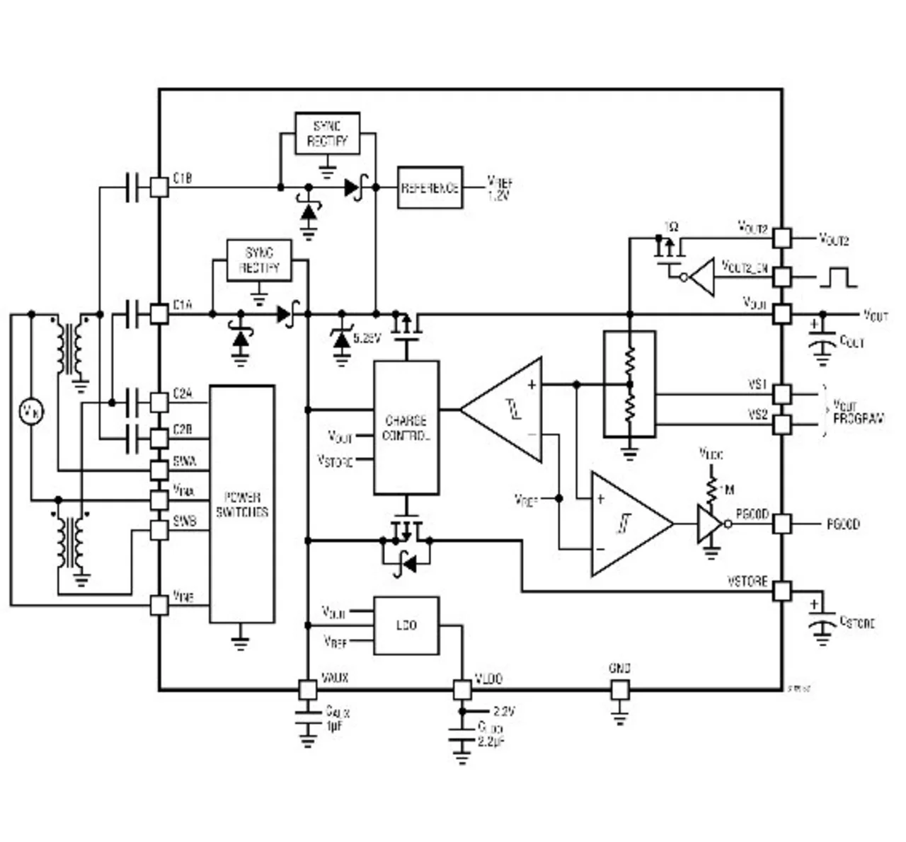 In dem LTC3109 ist außerdem ein VLDO-Längsregler mit einer Ausgangsspannung von 2,2 V integriert, der mit mindestens 5 mA belastbar ist. Bei einer Last von 2 mA liegt dessen Spannungsabfall bei rund 100 mV. Er eignet sich dazu, Low-Power-Mikroprozessoren oder andere ICs unter Spannung zu halten. Er kann zudem bereits den Betrieb aufnehmen, wenn die verfügbare Spannung über 2,3 V gestiegen ist, während der Speicher-Kondensator (oder Akku) noch geladen wird. Sollte der VLDIO-Regler einer Stoßbelastung ausgesetzt werden, kann er sich vorübergehend aus dem Pufferkondenstor speisen, der (extern) an den Hauptausgang angeschlossen ist.