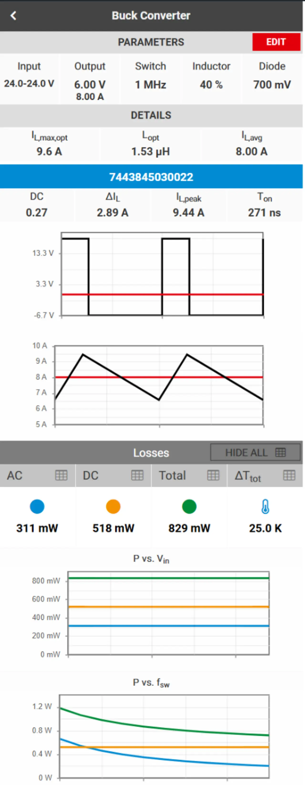 Das von Würth Elektronik entwickelte Online-Tool REDEXPERT unterstützt den Ingenieur bei der Auswahl einer geeigneten Induktivität für die jeweilige Anwendung und ermöglicht den Vergleich und die Auswahl der Komponenten innerhalb kürzester Zeit. Bild 2 zeigt ein Beispiel der REDEXPERT-Oberfläche für einen Abwärtswandler. Spezifische Anwendungsparameter - wie Eingangs- und Ausgangsspannung, Schaltfrequenz, Tastverhältnis und Ausgangsstrom - werden eingegeben, während die entsprechenden Induktivitätsverluste und der Temperaturanstieg berechnet und angezeigt werden. Die beiden unteren Diagramme veranschaulichen, wie die Verlustleistung mit der Eingangsspannung und der Schaltfrequenz variiert, so dass Ingenieure die Effizienz einer ausgewählten Induktivität unter verschiedenen Bedingungen bewerten können.
