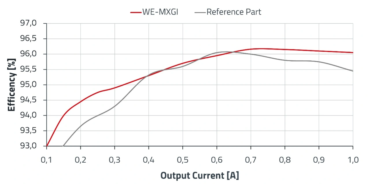 Basierend auf diesen Erkenntnissen bietet Würth Elektronik die neueste verpresste Leistungsinduktivität WE-MXGI an. Sie enthält ein innovatives Kernmaterial aus einer Metalllegierung, das eine maximale Leistungsdichte und eine hervorragende Strombelastbarkeit bei minimalen Verlusten ermöglicht. Bild 4 zeigt eine vergleichende Effizienzmessung auf einem Evaluation Board. Man beachte, dass die WE-MXGI im Vergleich zu ähnlichen Bauteilen auf dem Markt einen erstklassigen Wirkungsgrad über den Ausgangsstrom aufweist.