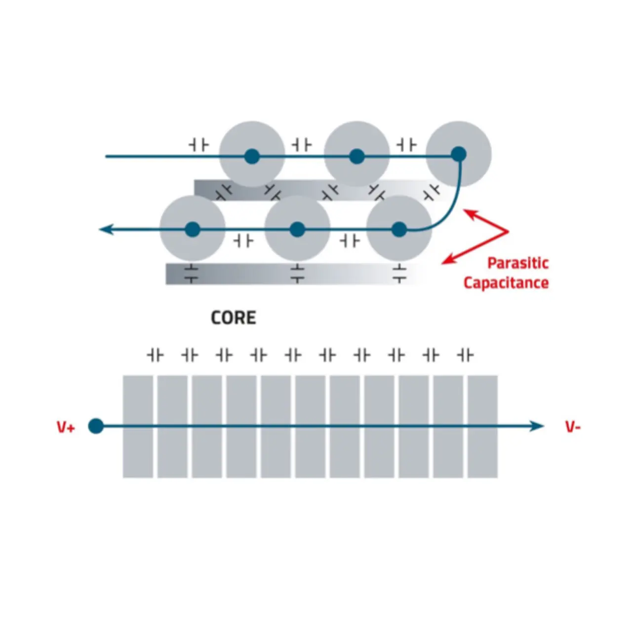 Neben der Wahl des Kernmaterials spielt auch das Wicklungsdesign eine wichtige Rolle bei den Gesamtverlusten einer Induktivität. In Hochfrequenzanwendungen werden zunehmend Flachdrahtwicklungen eingesetzt. Der große Leiterquerschnitt reduziert die Stromverdrängung und verteilt das elektrische Feld gleichmäßig, was die parasitäre Kapazität minimiert und die EMI-Effekte verringert (Bild 5). Durch die Verwendung von Flachdraht können niedrige RDC-Werte erreicht werden, was zu geringeren DC-Verlusten führt und folglich den Wirkungsgrad des Wandlers erhöht.