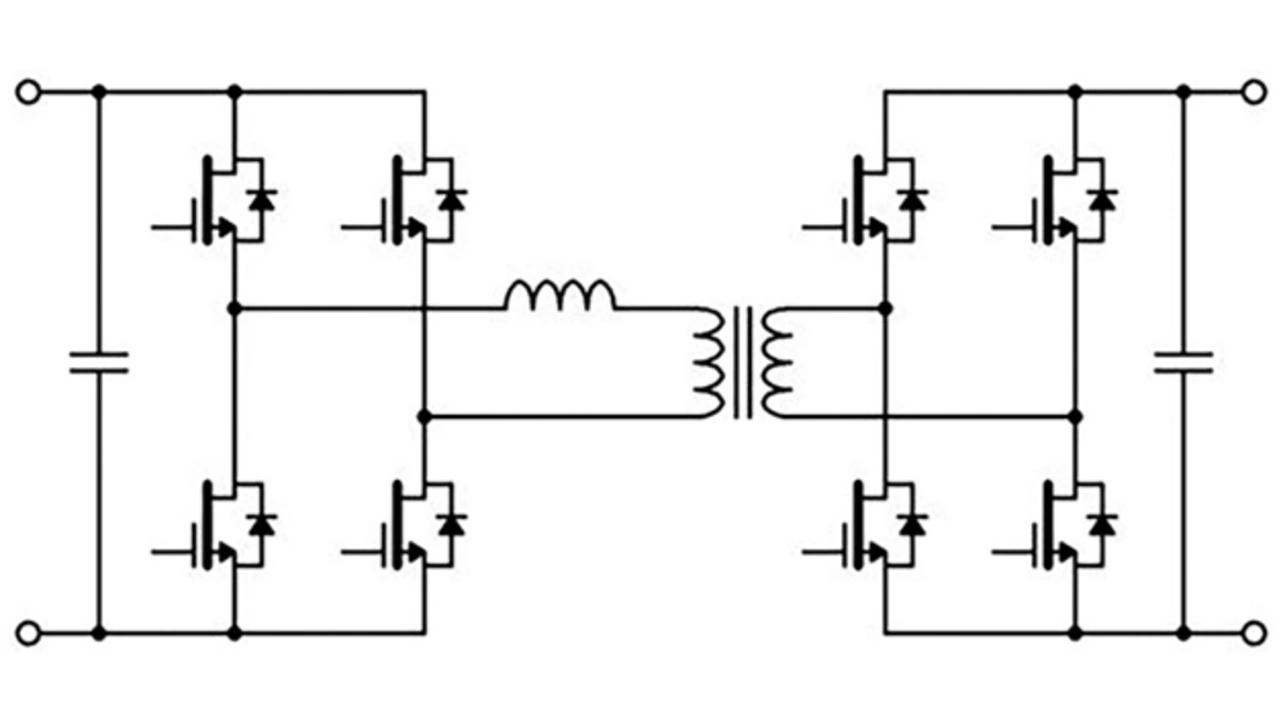 Die DC/DC-Umrichterstufe bietet eine Isolierung. Außerdem gibt es eine Auswahl an Topologien, die den bidirektionalen Betrieb sowie entlastetes Schalten zur Steigerung der Effizienz ermöglichen. In dieser Umrichterstufe ist die Resonanz-LLC- oder CLLC-Umwandlungstopologie mit einer einzelnen Brücke (1200-V-SiC) oder mit kaskadierten Brücken (600 V) weitverbreitet. Allerdings ist es schwierig, die Anforderungen an die Ausgangsspannung durch die Frequenzmodulationssteuerung zu erfüllen – typischerweise liegen diese zwischen 200 und 929 V. Eine gängige Lösung für derartig hohe Leistungen ist die ebenfalls im Bild dargestellte Dual Active Bridge (DAB), also ein PWM-Umrichter mit fester Frequenz, der für einen breiten Lastbereich mit entlastetem Schalten designt werden kann.