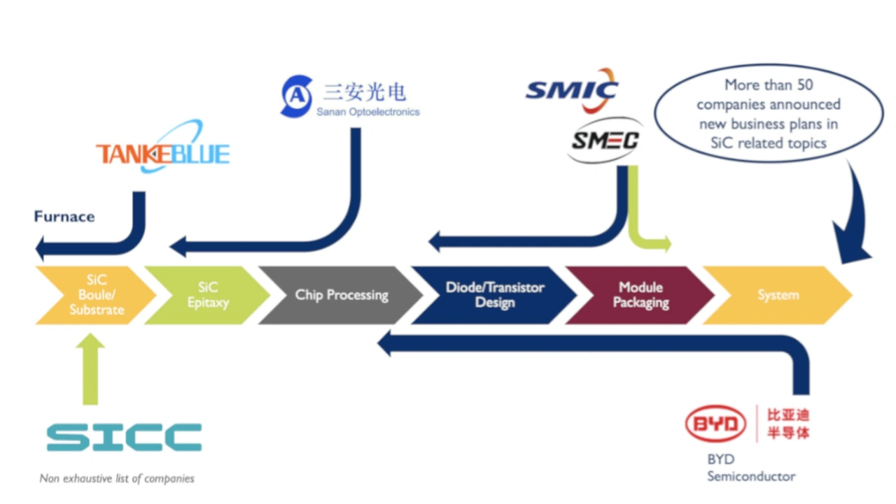 Mehr als 50 chinesische Unternehmen haben angekündigt, auf verschiedenen Ebenen und mit unterschiedlichen Strategien in das SiC-Geschäft einzusteigen. Einige Wafer-Lieferanten fügen eine beträchtliche Anzahl von Öfen hinzu, während einige Akteure aus anderen Bereichen einsteigen.