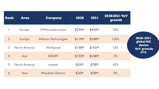 Tabelle: Umsätze der größten Anbieter von Siliziumkarbid-Bauelementen für die Jahre 2020 und 2021