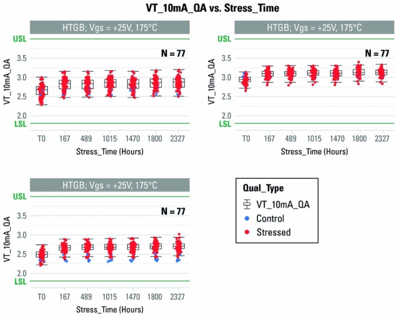 In den Bildern 1 und 2 sind HTGB-Tests (High Temperature Gate Bias) bei einer Gate-Source Spannung UGS von –10 V und +25 V zu sehen. Dies belegt die Stabilität der Schwellenspannung. Die Abweichungen bleiben bei weniger als 300 mV nach 2300 Stunden bei +175 °C.