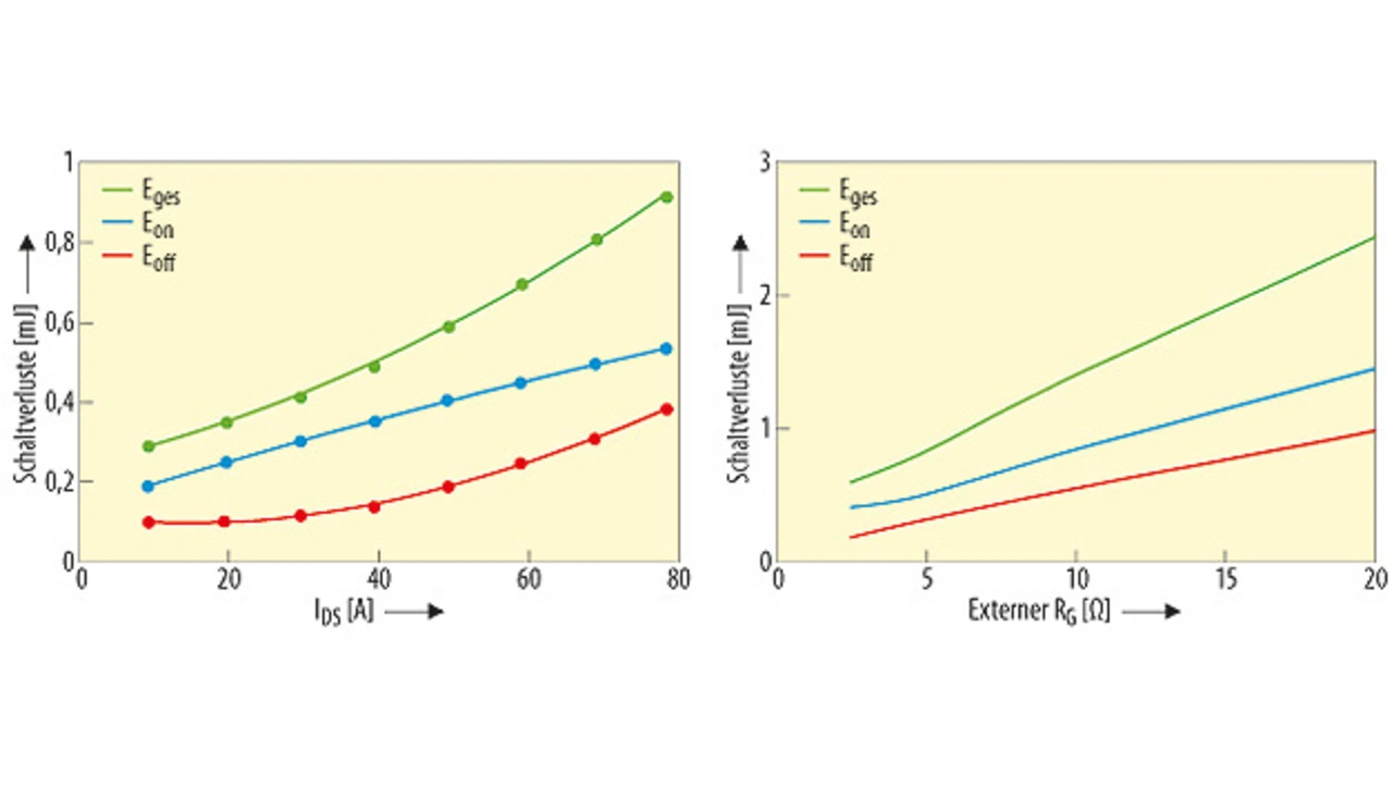 Bild 3 zeigt die Messwerte der Schaltenergie beim Schalten der Gate-Spannung von –4 V bis +15 V und der Drain-Spannung von 800 V bis 0 V. Bei 60 A wurden nur 0,7 mJ bei einem externen Gate-Widerstand von 2,5 Ω gemessen. In Bild 3 sind daneben auch die Schaltverluste als Funktion des externen Gate-Widerstandes dargestellt. Ein größerer RG(ext) kann Stromkurven begradigen und die EMI-Filterung vereinfachen, dies jedoch auf Kosten von höheren Schaltverlusten.