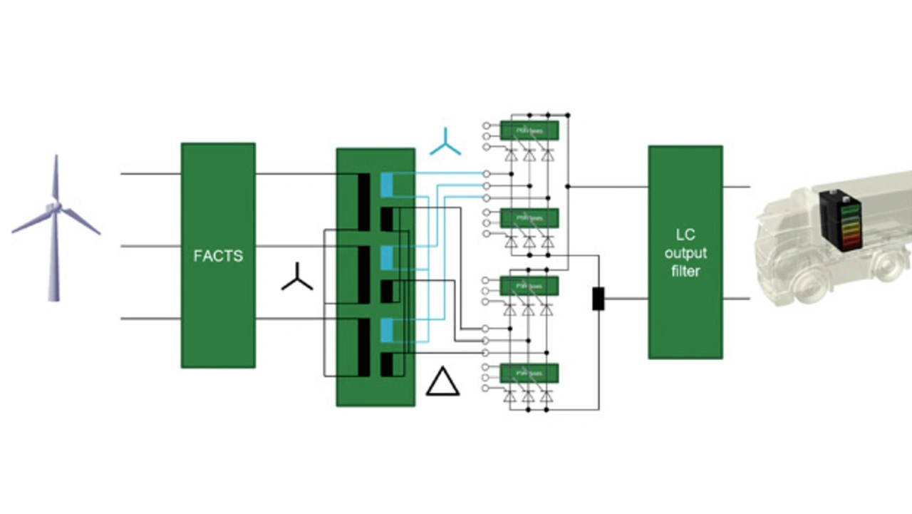 Bild 3 vermittelt einen Eindruck von dem Unterschied, der erreicht werden kann. Das Bild zeigt den Aufbau der Komponenten, die zum Bau eines 2,5-MW-Ladegeräts für Nutzfahrzeuge benötigt werden. Der thyristorbasierte Ansatz hat den beispiellosen Wirkungsgrad einer einstufigen Energieumwandlung, der bis zu 99,8 Prozent erreicht, gepaart mit einer nachgewiesenen Erfolgsbilanz von jahrzehntelangem Betrieb ohne Ausfälle aufgrund von Ermüdung.