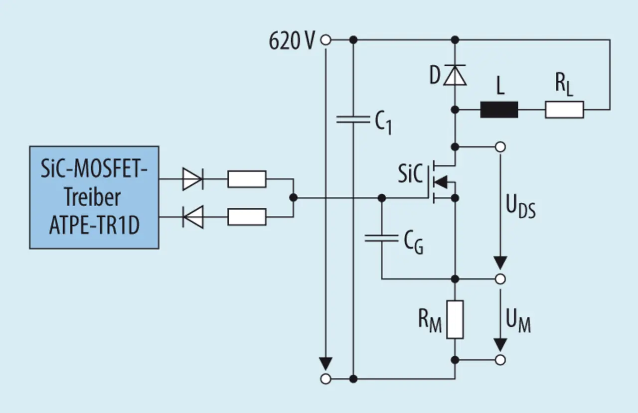 Bild 2 zeigt die Schaltung zur Ermittlung der Ausschaltenergie Eoff. Die Spannung im Zwischenkreis beträgt 620 V und der Lastwiderstand R wird so eingestellt, dass der Strom ID durch den SiC-MOSFET 20 A oder 40 A beträgt. Beim Ausschaltvorgang werden die Drain-Source-Spannung UDS und der Strom ID durch die Spannung UM am Messwiderstand RM gemessen, dessen Wert 0,5 Ω mit einer Induktivität <5 nH beträgt.