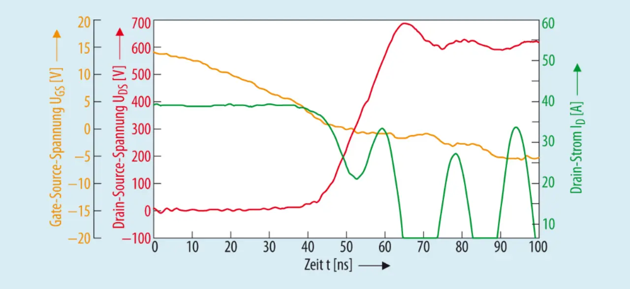 Die zusätzliche Kapazität am Gate dämpft die angeregte Schwingung durch den rückgekoppelten Impuls am Gate und die schnell abfallende Spannung an der Kapazität CG erzeugt einen hohen negativen Ladestrom am Gate. So fällt die Gate-Source-Spannung trotzdem schnell ab und die durch den rückgekoppelten Spannungsimpuls entstehenden Verluste bleiben sehr gering.
