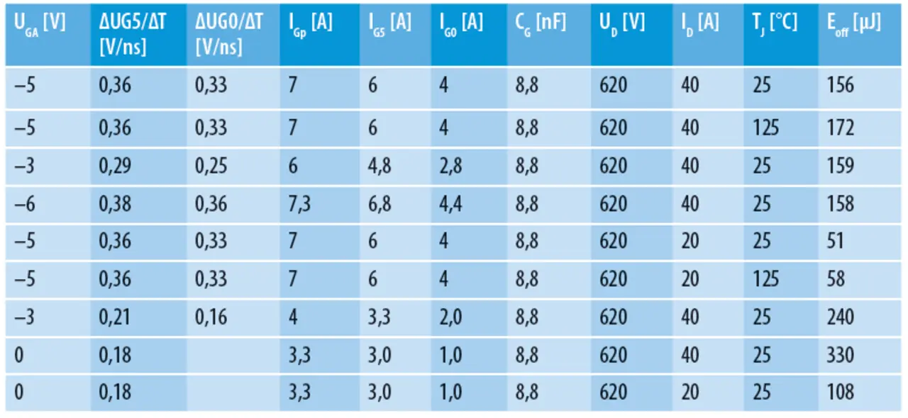 Mit zusätzlichen, kalorimetrischen Kontrollmessungen wurden die Ergebnisse der Tabelle überprüft. Bei diesen Messungen wurde die Verlustleistung des SiC-MOSFET direkt bei 50 kHz über die Erwärmung eines Kühlkörpers gemessen. Die Kontrollmessung bei 620 V und 40 A mit dem Gate-Strom von 4 A bei 0 V ergab im Rahmen der Messgenauigkeit Übereinstimmung mit dem Wert für die Ausschaltenergie Eoff aus der Tabelle. Bei 620 V und 20 A waren die Werte sogar noch günstiger.