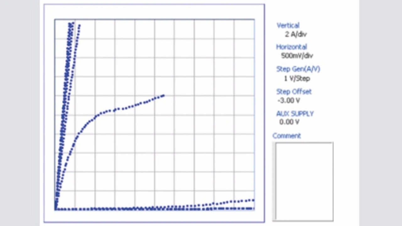 Jeder dieser Ansätze hat Vor- und Nachteile und mehrere Hersteller haben bereits Halbleiter mit indirektem normally-off-Betriebsmodus auf den Markt gebracht. Diese zeigen deutliche Fortschritte hinsichtlich der Betriebssicherheit. In Bild 4 ist die Ausgabecharakteristik eines GaN-HEMT (25 A, 650 V) von STMicroelectronics abgebildet. Der High-Electron-Mobility-Transistor wurde durch Abscheidung von GaN auf einem 6-Zoll-Siliziumwafer mittels Hetero-Epitaxie hergestellt. Beim Kristallwachstum mittels Hetero-Epitaxie wächst ein kristalliner Film (z. B. GaN) auf einem kristallinen Substrat (z. B. Si). Der spezifische Durchlasswiderstand ist 4 mΩ×cm2.