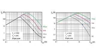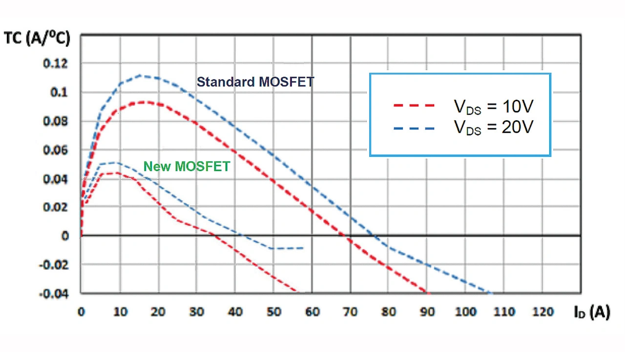 Ein Vergleich der Temperaturkoeffizienten eines herkömmlichen STripFET-F7-MOSFETs und des neuen Wide-SOA-Bausteins STH200N10WF7-2 ist in Bild 6 zu sehen. Ist der TC null oder hat er negatives Vorzeichen, nimmt der Drain-Strom mit steigender Temperatur ab, sodass der Baustein thermisch stabil ist. Allerdings lässt sich der Baustein auch bei positivem TC betreiben, ohne auszufallen. Ob das möglich ist, hängt von der Wärmekapazität des gesamten Chips und damit der Fähigkeit ab, die pro Flächeneinheit anfallende Wärme abzuleiten. Wenn die über die Zeit erzeugte Wärme vollständig vom Baustein selbst aufgenommen werden kann, befindet sich der Leistungs- MOSFET folglich in einem sicheren Arbeitsbereich [2].