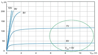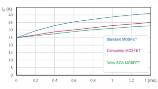 Wegen der design- und optimierungsbedingten Abstriche ist die Stromverstärkung beim STH200N10WF7-2 bei niedrigeren Gate-Source-Spannungen UGS geringer, um den Stromanstieg zu begrenzen und einem thermischen Durchgehen im linearen Betrieb vorzubeugen. Dagegen ist die Stromverstärkung bei größeren Werten von UGS höher, um den Einschaltwiderstand RDS(on) im Schaltbetrieb zu verringern (Bild 4). Dank dieser Eigenschaft lässt sich der Wide-SOA-Baustein im PWM-Modus (Pulse Width Modulation) betreiben, nachdem er nach dem Einschalten im linearen Modus den Einschaltstrom begrenzt hat.